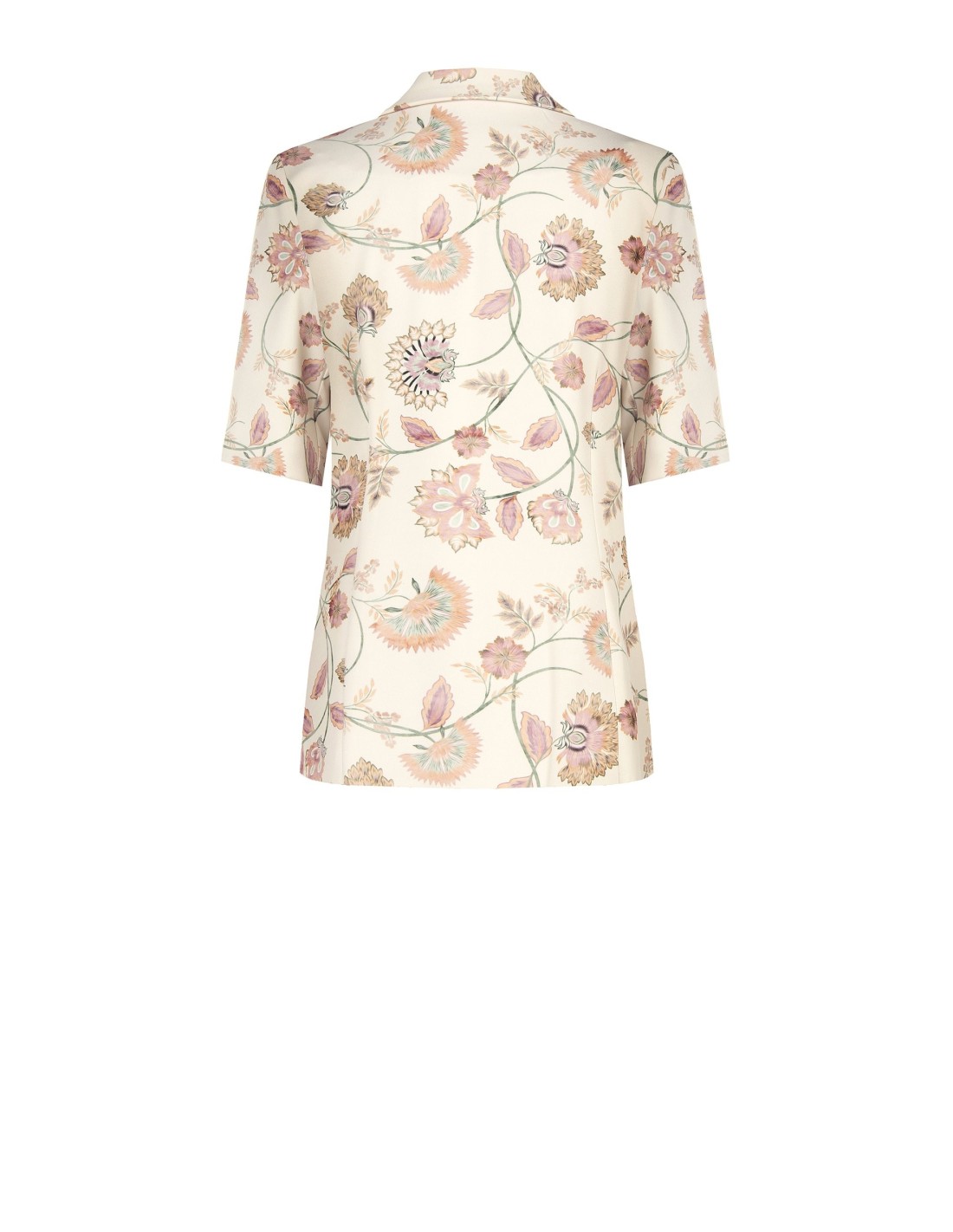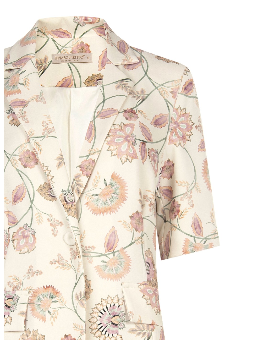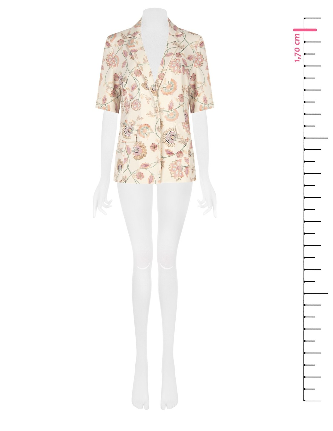 Blazer de corte suave e ligeiramente direito, em tecido fluido de toque liso com estampado floral. A lapela clássica e o fecho com botão conferem definição à silhueta, enquanto as mangas curtas o tornam versátil e confortável. Perfeito para escritório, brunch e chic do dia a dia.