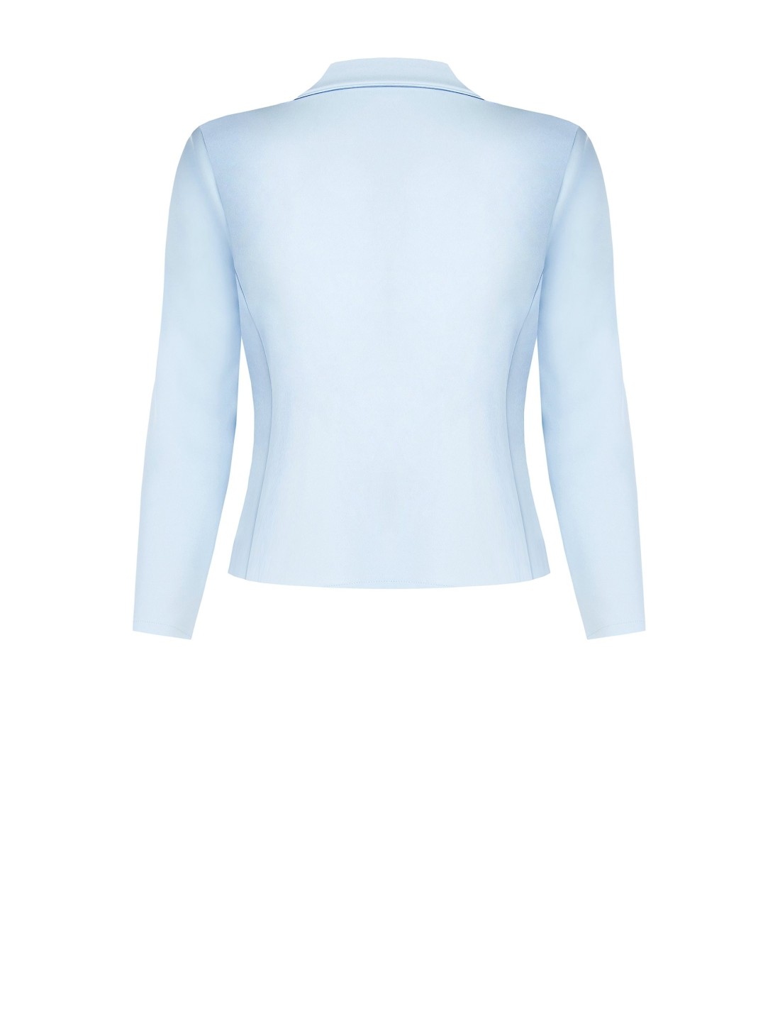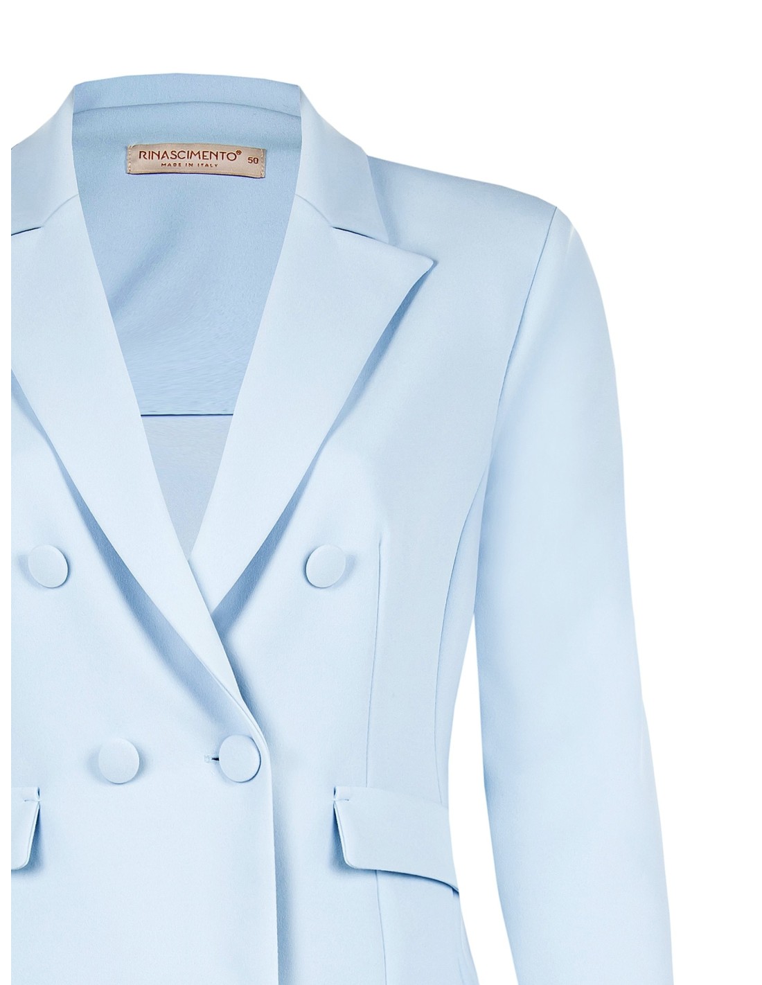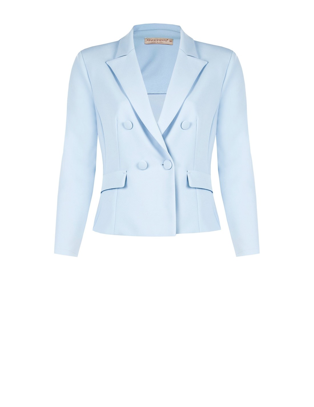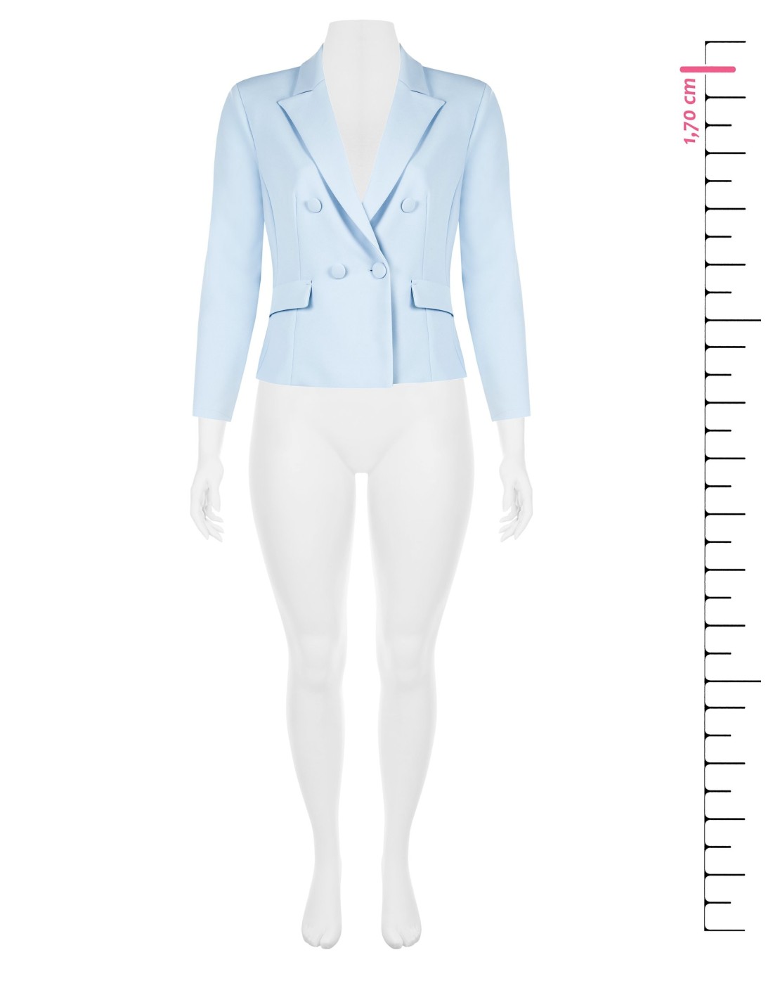 Blazer de duplo peito em tecido liso e ligeiramente elástico, concebido para valorizar as formas curvy com corte justo na cintura. Lapela em bico e botões forrados definem a silhueta, enquanto os bolsos com pala acrescentam carácter. Perfeito do escritório ao aperitivo.