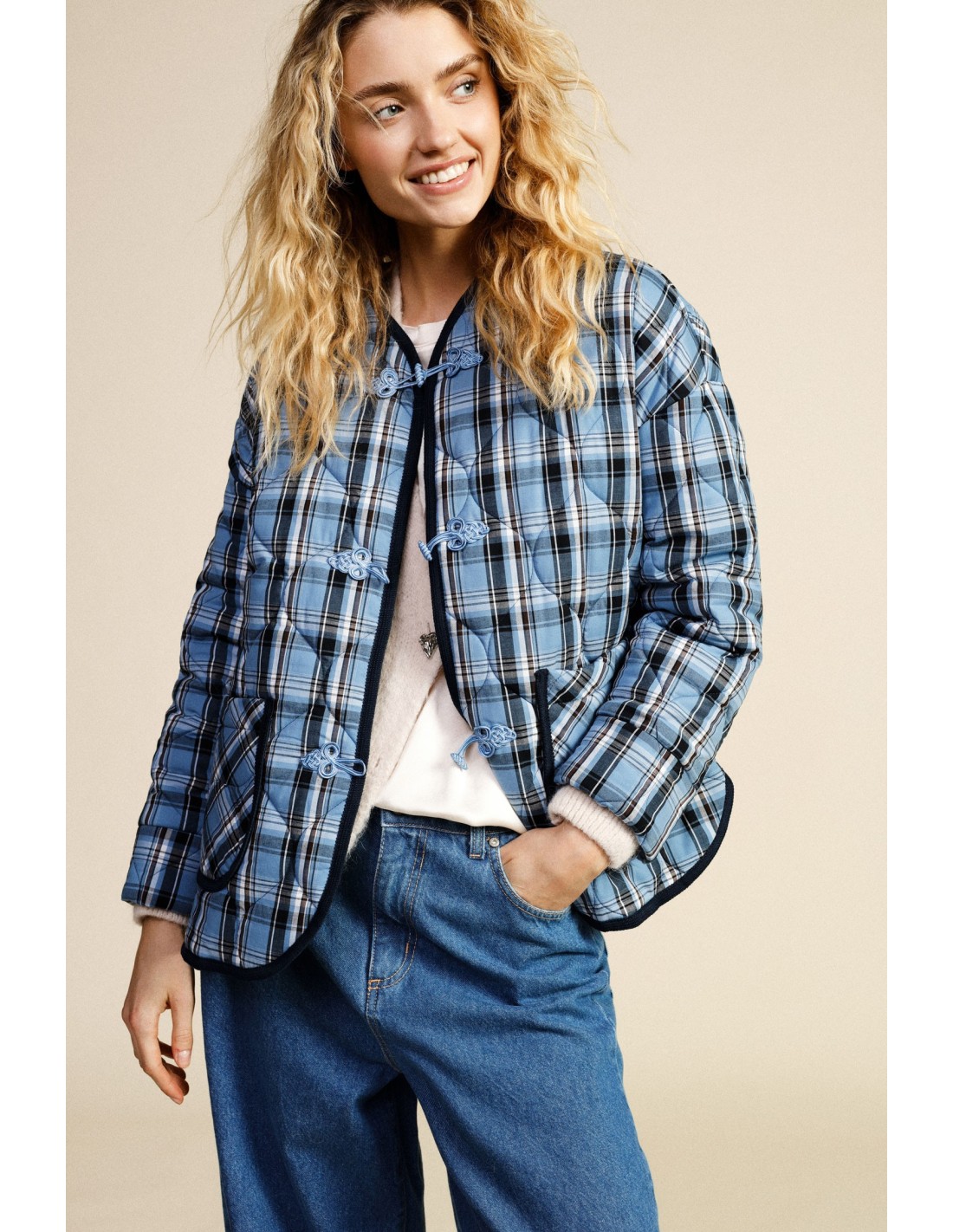 Casaco acolchoado com padrão xadrez, embelezado com alamares decorativos na frente. Os grandes bolsos aplicados acrescentam um toque prático, ideal para ter tudo à mão. Corte suave para um conforto natural no dia a dia, perfeito para combinar com looks casuais ou mais sofisticados.
