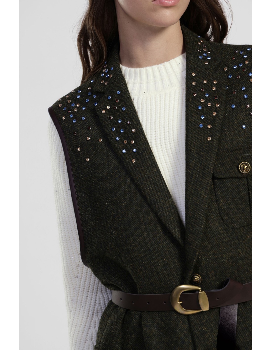 Deixe-se surpreender pelo colete padrão pied-de-poule, perfeito para adicionar carácter aos seus looks do dia a dia. O cinto à cintura com fivela dourada cria uma silhueta cuidada enquanto os bolsos aplicados e os detalhes decorativos nos ombros conferem originalidade. Uma peça versátil, ideal sobre uma camisa ou uma gola alta.