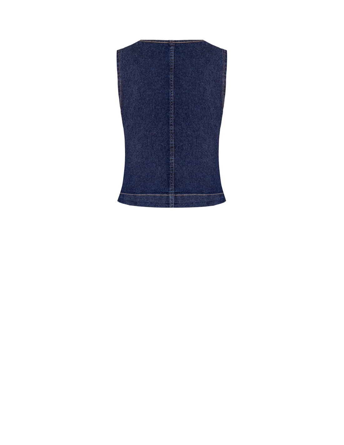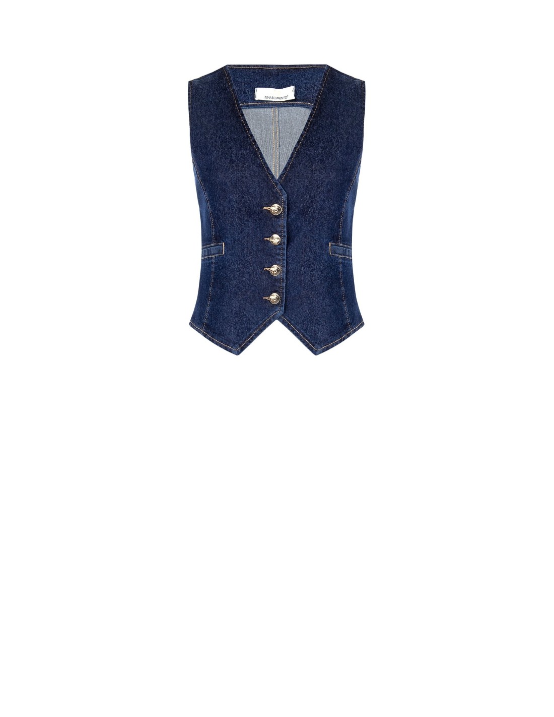Corpete em ganga stretch de corte justo que esculpe a silhueta sem renunciar ao conforto. Decote em V feminino, barra pontiaguda e botões metálicos decorativos valorizam a cintura. Perfeito sobre camisas ou tops para o escritório, o aperitivo ou o fim de semana.