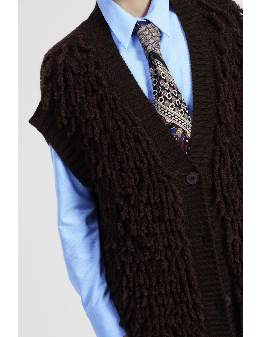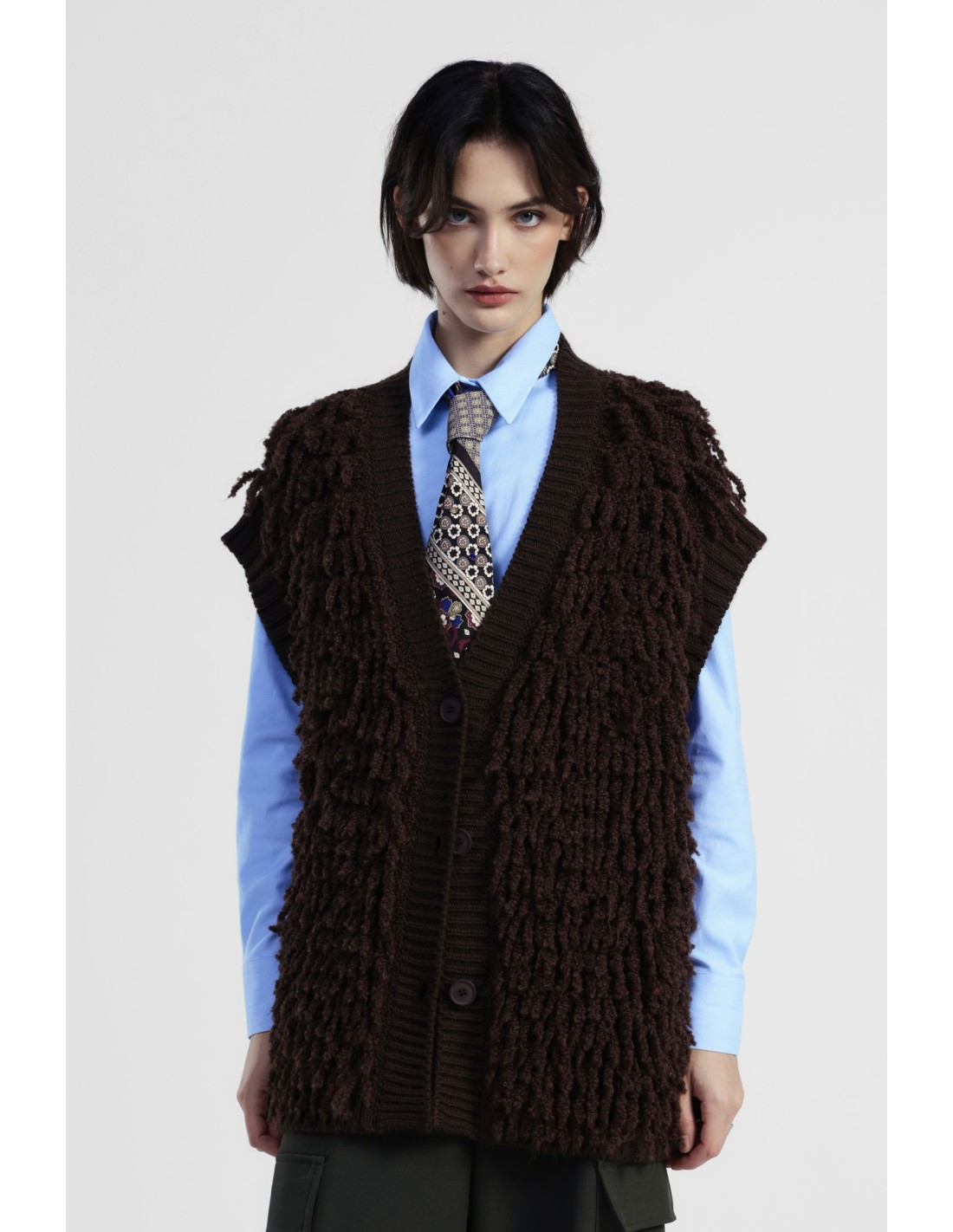 Dá personalidade aos teus looks do dia a dia com este colete em malha, enriquecido com um painel frontal com efeito encaracolado. O design sem mangas e o fecho de botões tornam-no versátil para todas as estações, perfeito para usar por cima de uma camisa ou sozinho, para um toque original e divertido.