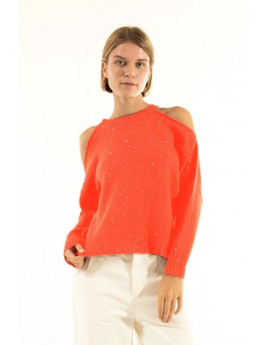 Camisola Kontatto de corte macio e feminino. Fio suave com micro lantejoulas que iluminam sem renunciar ao conforto. Ombros descobertos e bordos canelados definem a silhueta com um toque sensual. Perfeita do dia para a noite: do trabalho com denim ou alfaiataria, até ao aperitivo.