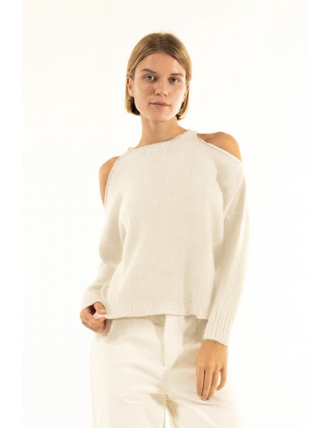 Camisola Kontatto de corte macio e feminino. Fio suave com micro lantejoulas que iluminam sem renunciar ao conforto. Ombros descobertos e bordos canelados definem a silhueta com um toque sensual. Perfeita do dia para a noite: do trabalho com denim ou alfaiataria, até ao aperitivo.