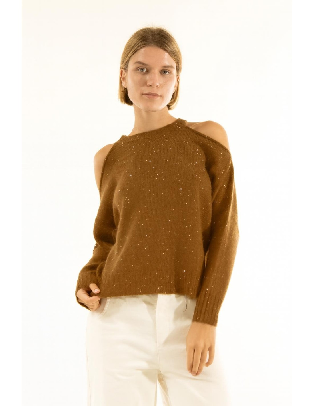 Camisola Kontatto de corte macio e feminino. Fio suave com micro lantejoulas que iluminam sem renunciar ao conforto. Ombros descobertos e bordos canelados definem a silhueta com um toque sensual. Perfeita do dia para a noite: do trabalho com denim ou alfaiataria, até ao aperitivo.