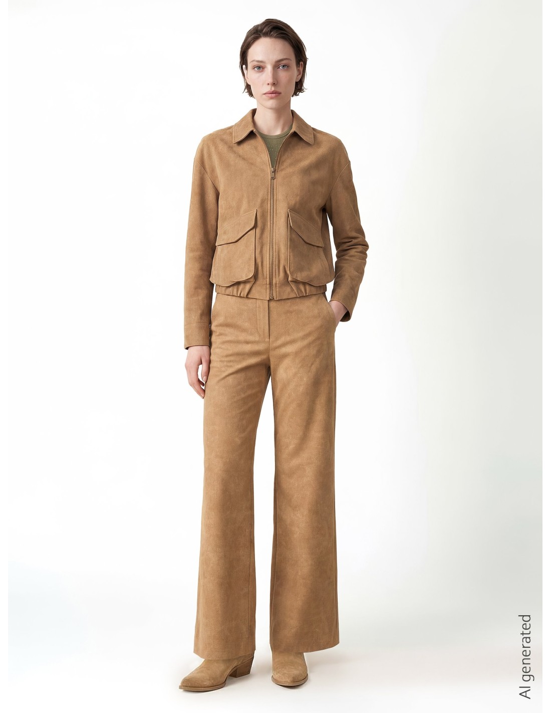 Casaco curto em suave camurça sintética com efeito esbatido, de corte descontraído que valoriza a silhueta sem marcar. Fecho de correr metálico e bolsos maxi com pala conferem carácter e praticidade. Perfeito para o quotidiano, do escritório ao fim de semana urban-chic.