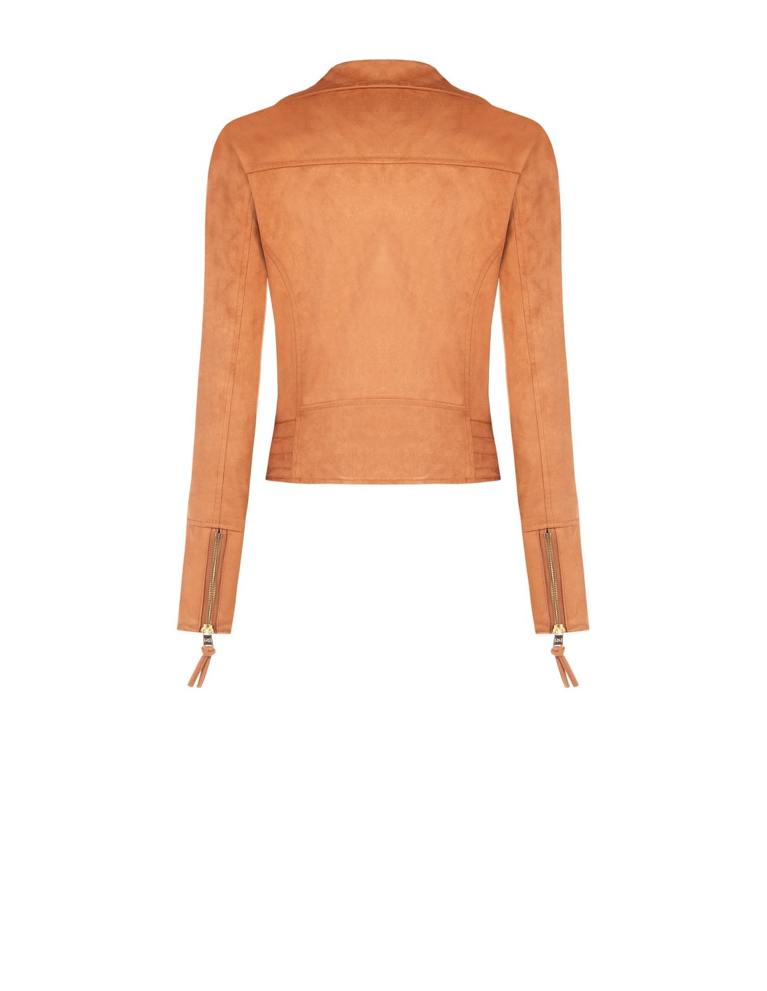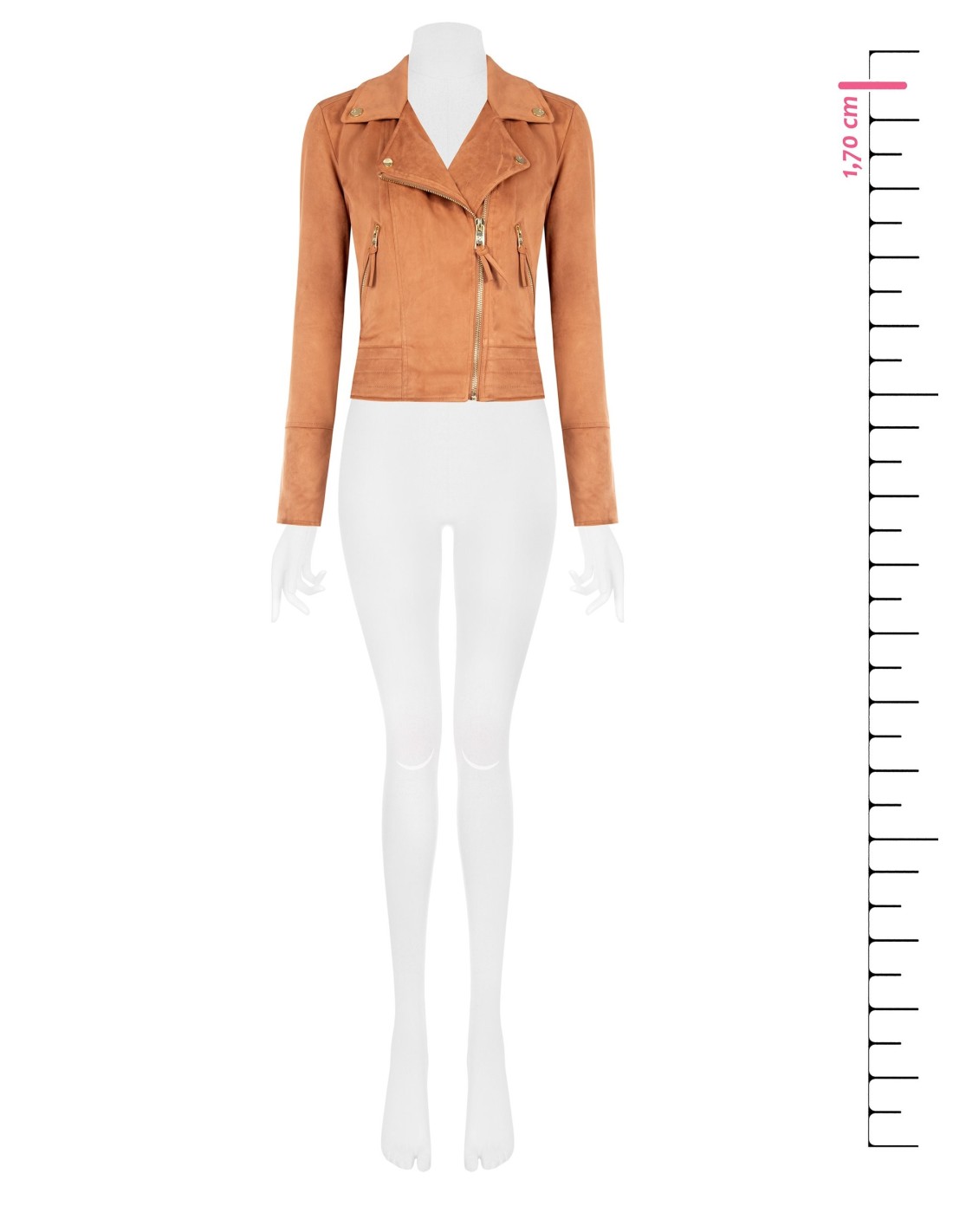 Casaco biker curto em suave pele sintética tipo camurça, com corte justo que realça a silhueta sem apertar. Fecho assimétrico frontal e punhos com fechos metálicos acrescentam um toque marcante. Perfeito sobre vestidos ou denim, do escritório ao aperitivo.
