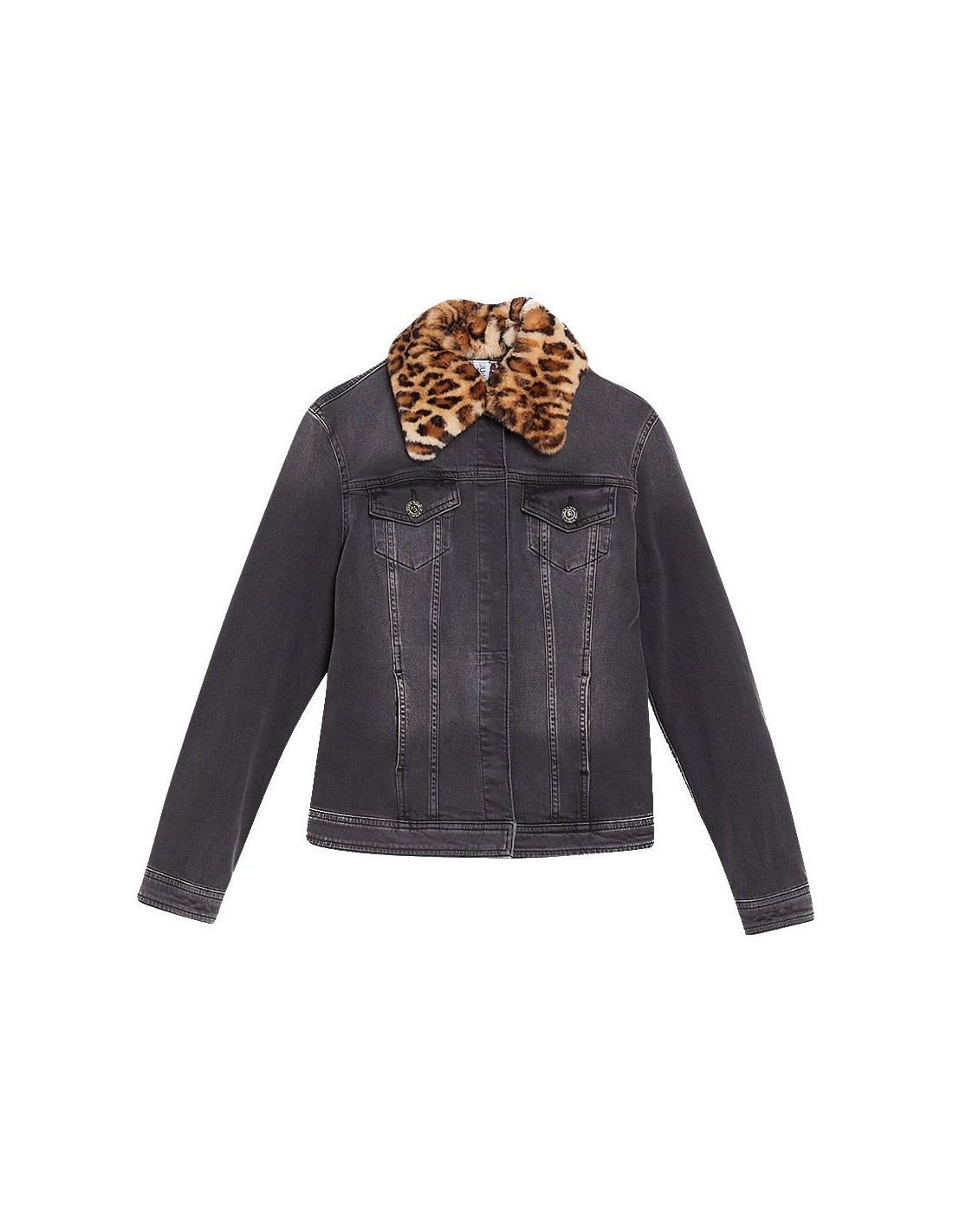 Casaco em ganga com pêlo sintético, gola redonda, mangas compridas.