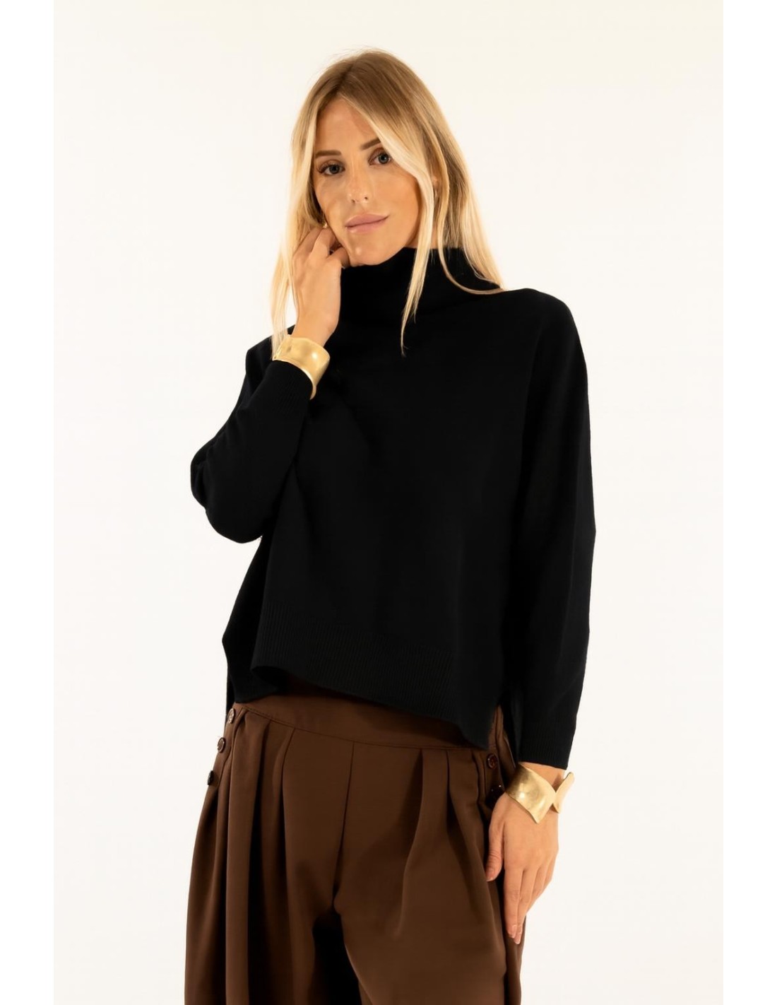Camisola Kontatto de corte solto e ligeiramente curta, pensada para valorizar a silhueta com conforto. Em fio macio com toque quente, acabamento suave com bainhas caneladas. Gola envolvente e fendas laterais para liberdade de movimento. Perfeita para o escritório com calças largas ou para o dia a dia com denim.