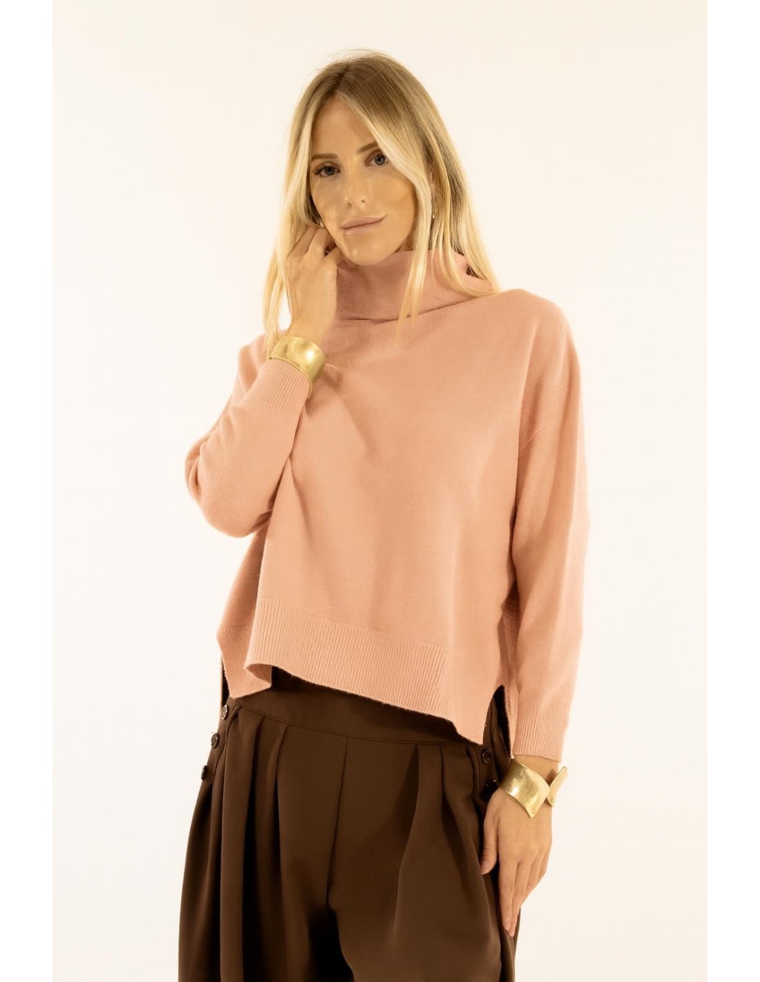 Camisola Kontatto de corte solto e ligeiramente curta, pensada para valorizar a silhueta com conforto. Em fio macio com toque quente, acabamento suave com bainhas caneladas. Gola envolvente e fendas laterais para liberdade de movimento. Perfeita para o escritório com calças largas ou para o dia a dia com denim.