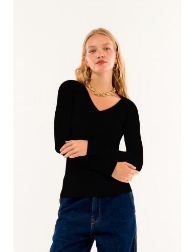 Linhas essenciais e tecido envolvente: esta camisola realça a feminilidade com um delicado decote em V e uma textura canelada. Perfeita para criar looks sofisticados e requintados, confere uma elegância natural a qualquer ocasião.