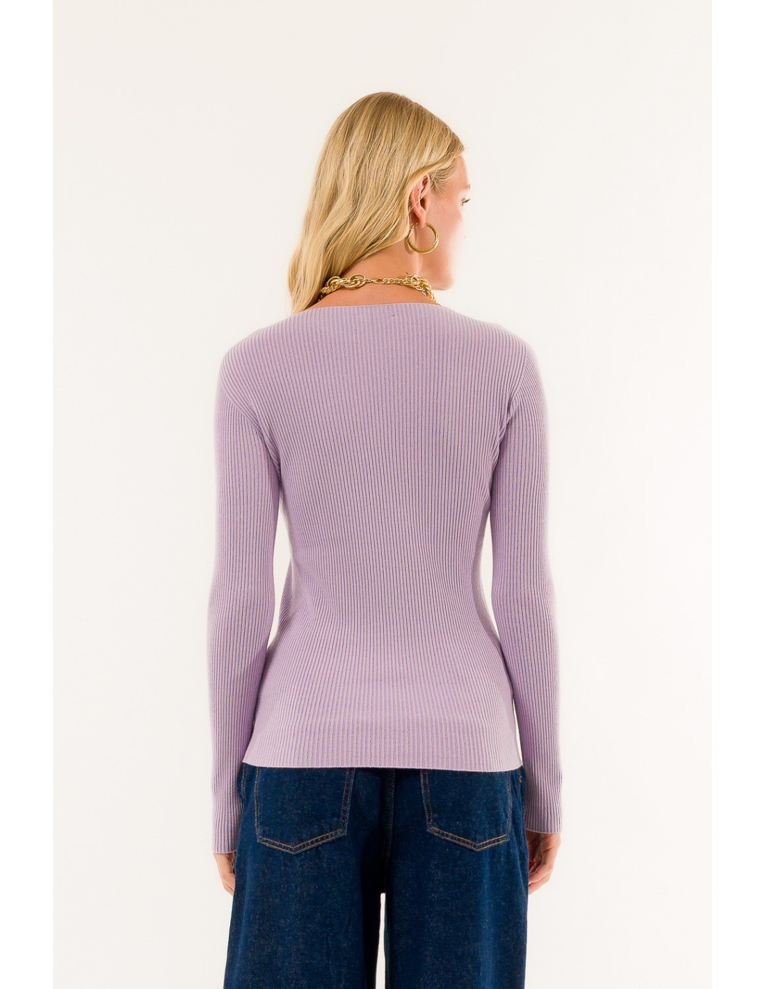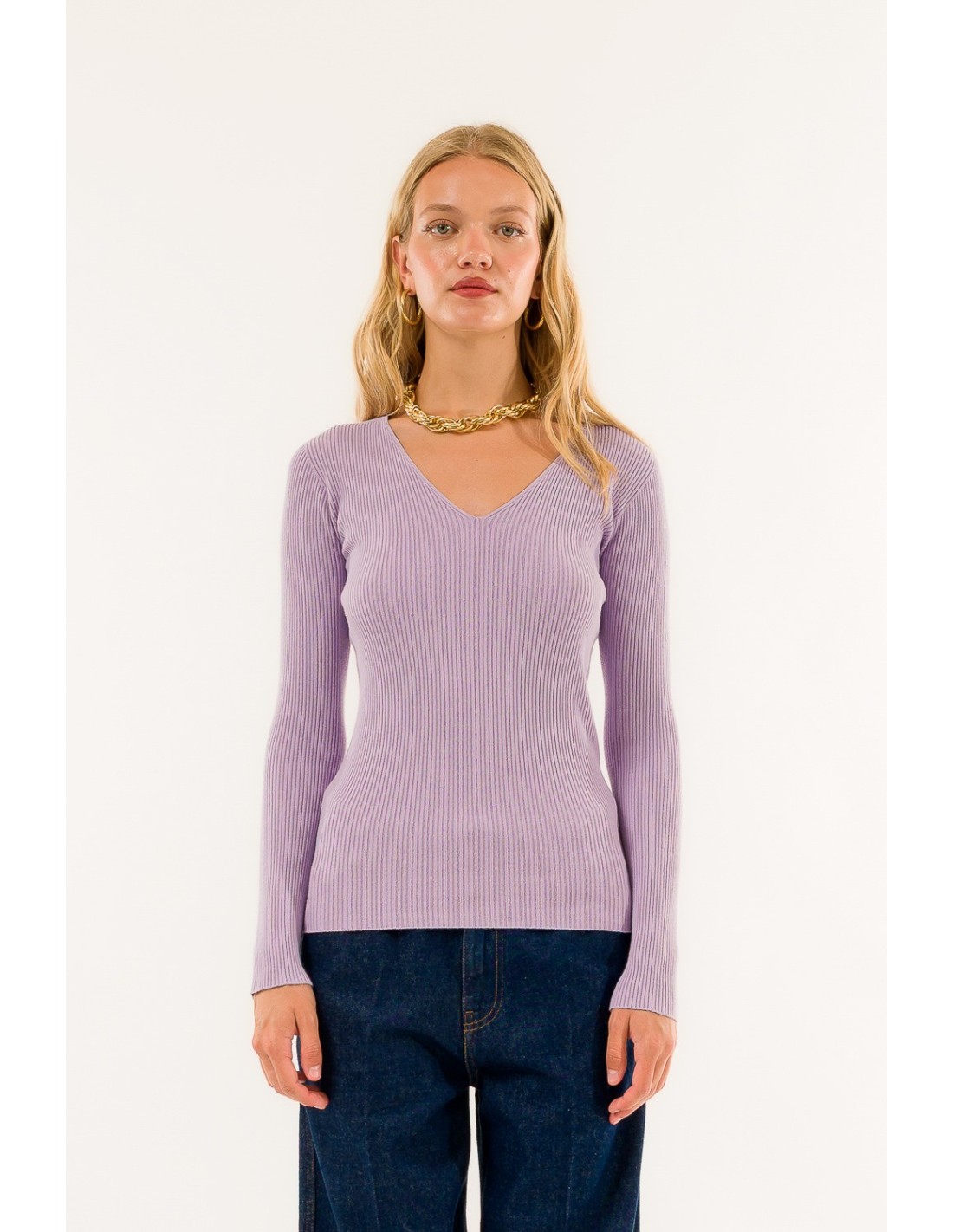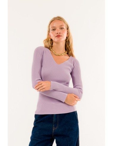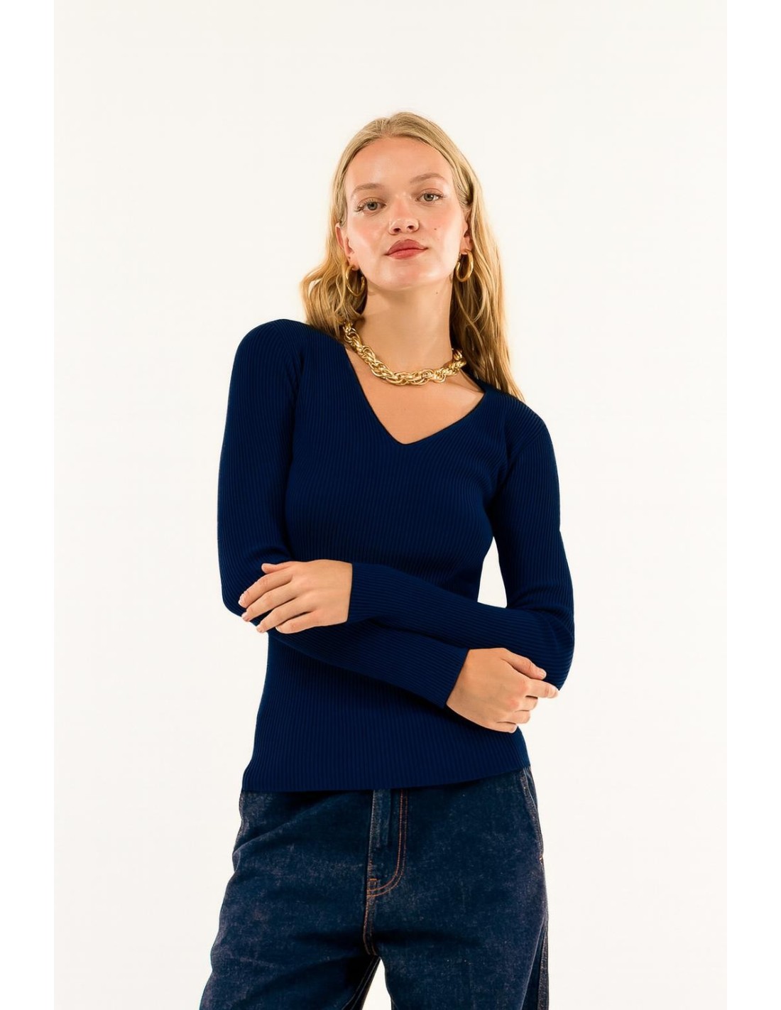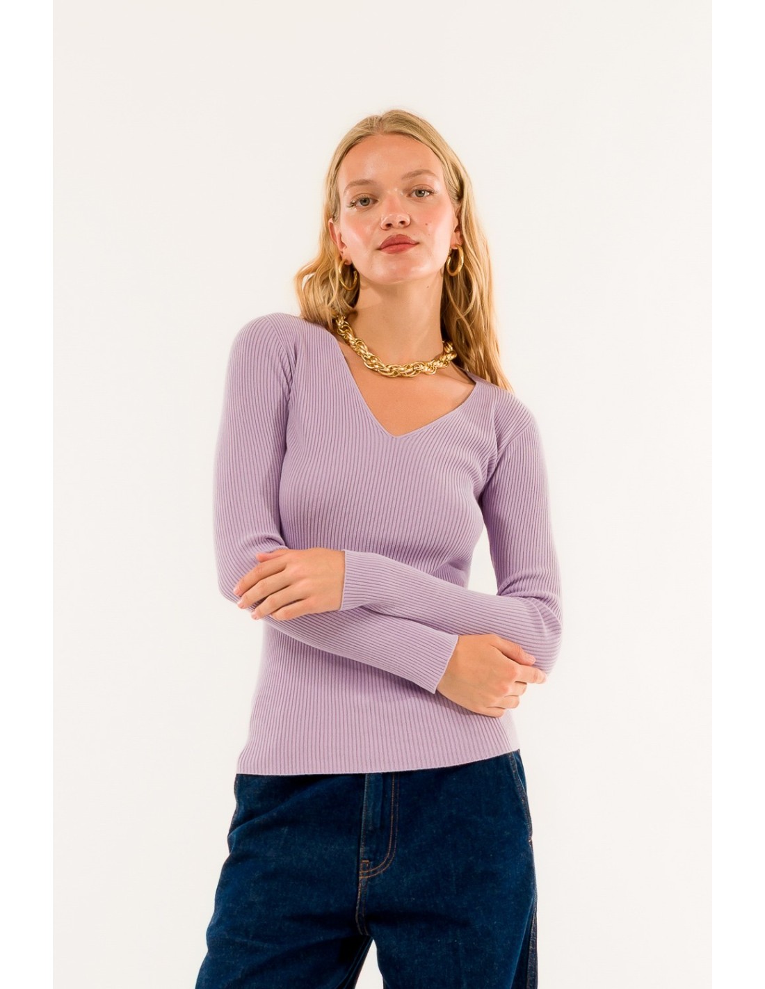 Linhas essenciais e tecido envolvente: esta camisola realça a feminilidade com um delicado decote em V e uma textura canelada. Perfeita para criar looks sofisticados e requintados, confere uma elegância natural a qualquer ocasião.