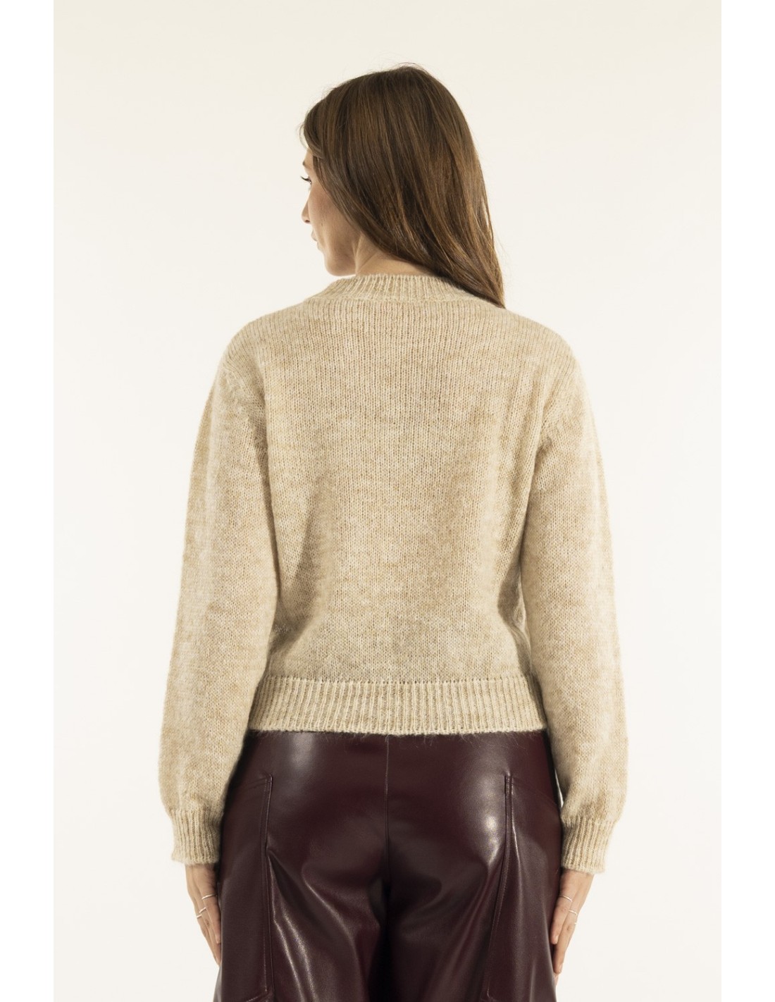 Camisola Kontatto de corte macio e ligeiramente curta, desenhada para valorizar a silhueta com conforto. Fio macio com efeito peluche e toque quente. Detalhe distintivo: padrão jacquard frontal e bordas caneladas no decote, punhos e barra. Perfeita para o dia a dia e para a casual Friday, para usar com denim ou pele.