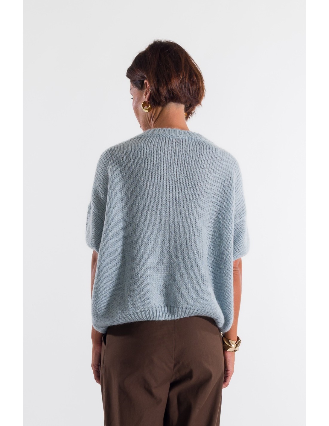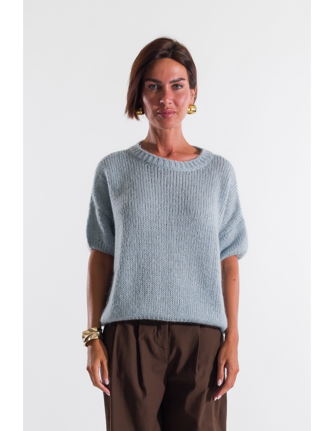 Kontatto malha de mangas curtas com um corte macio, que acaricia a silhueta sem marcar. Fio macio e leve com efeito fluffy. Decote redondo em canelado e barra elástica para maior conforto. Versátil do escritório ao dia a dia, combina com denim ou tailoring para um estilo cuidado e feminino.