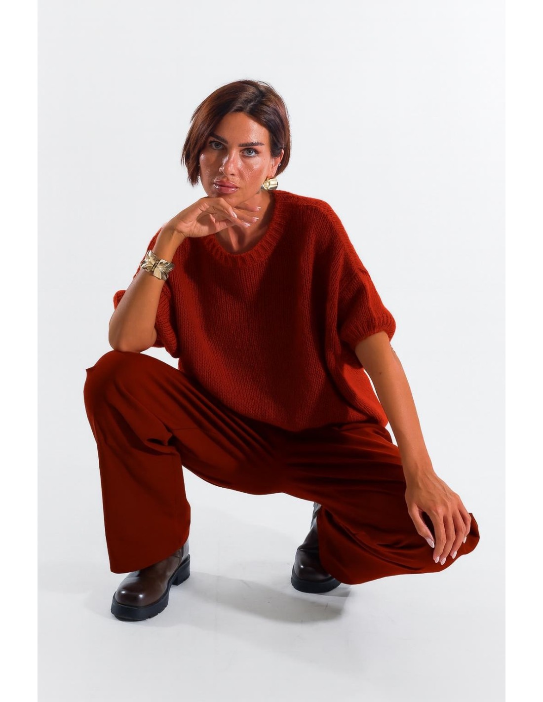 Kontatto malha de mangas curtas com um corte macio, que acaricia a silhueta sem marcar. Fio macio e leve com efeito fluffy. Decote redondo em canelado e barra elástica para maior conforto. Versátil do escritório ao dia a dia, combina com denim ou tailoring para um estilo cuidado e feminino.