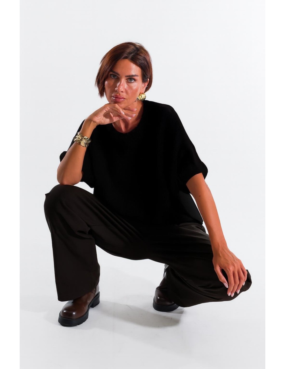 Kontatto malha de mangas curtas com um corte macio, que acaricia a silhueta sem marcar. Fio macio e leve com efeito fluffy. Decote redondo em canelado e barra elástica para maior conforto. Versátil do escritório ao dia a dia, combina com denim ou tailoring para um estilo cuidado e feminino.