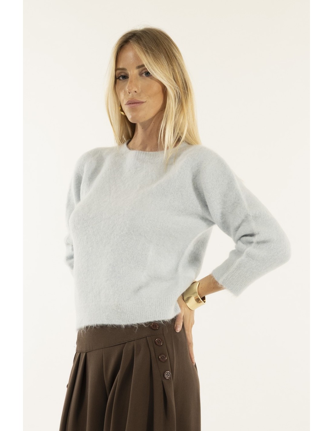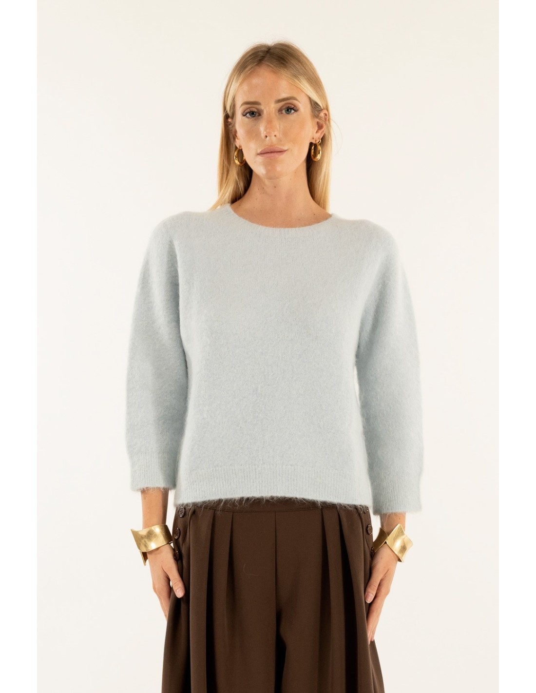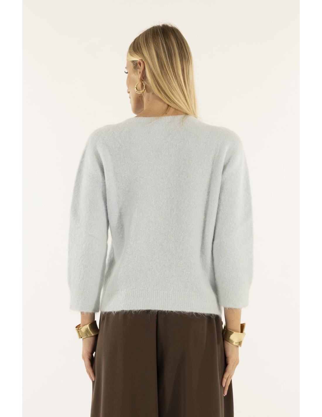 Camisola Kontatto com ajuste macio e ligeiramente curta, envolvente mas leve. Fio macio com toque felpudo e bordas caneladas para definir a silhueta. Mangas três quartos e decote limpo, perfeita por baixo de blazer ou com saias de cintura alta. Ideal para o escritório e para o dia a dia, com conforto sem renunciar ao estilo.