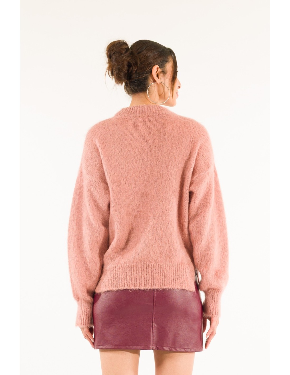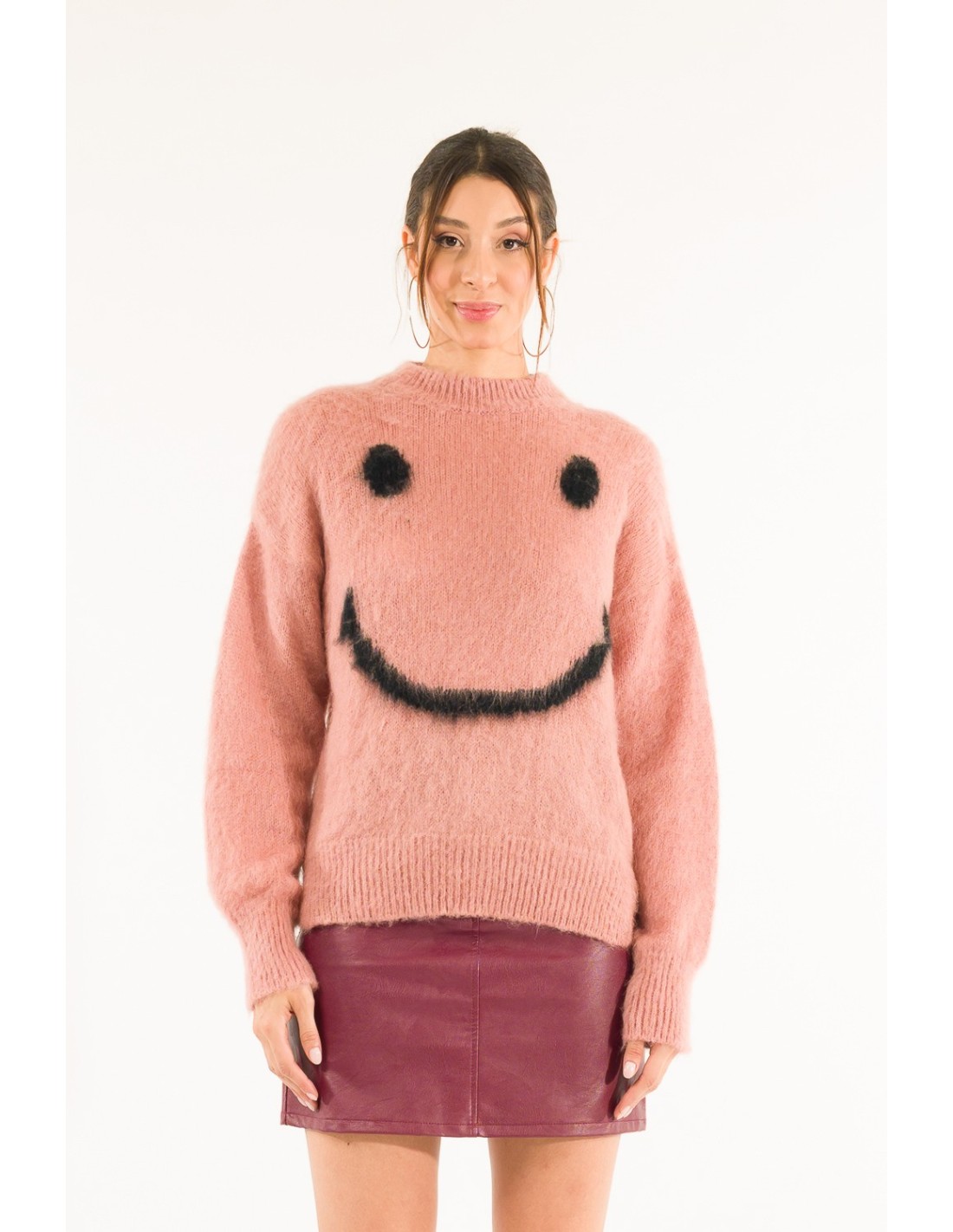 Camisola Kontatto de corte macio, em fio suave com efeito hair para um conforto envolvente. Intarsia frontal com maxi smile e bordas caneladas que definem a silhueta. Gola redonda e mangas ligeiramente balloon. Perfeita para o dia a dia e o tempo livre, para usar com denim ou mini para um toque irónico-chic.