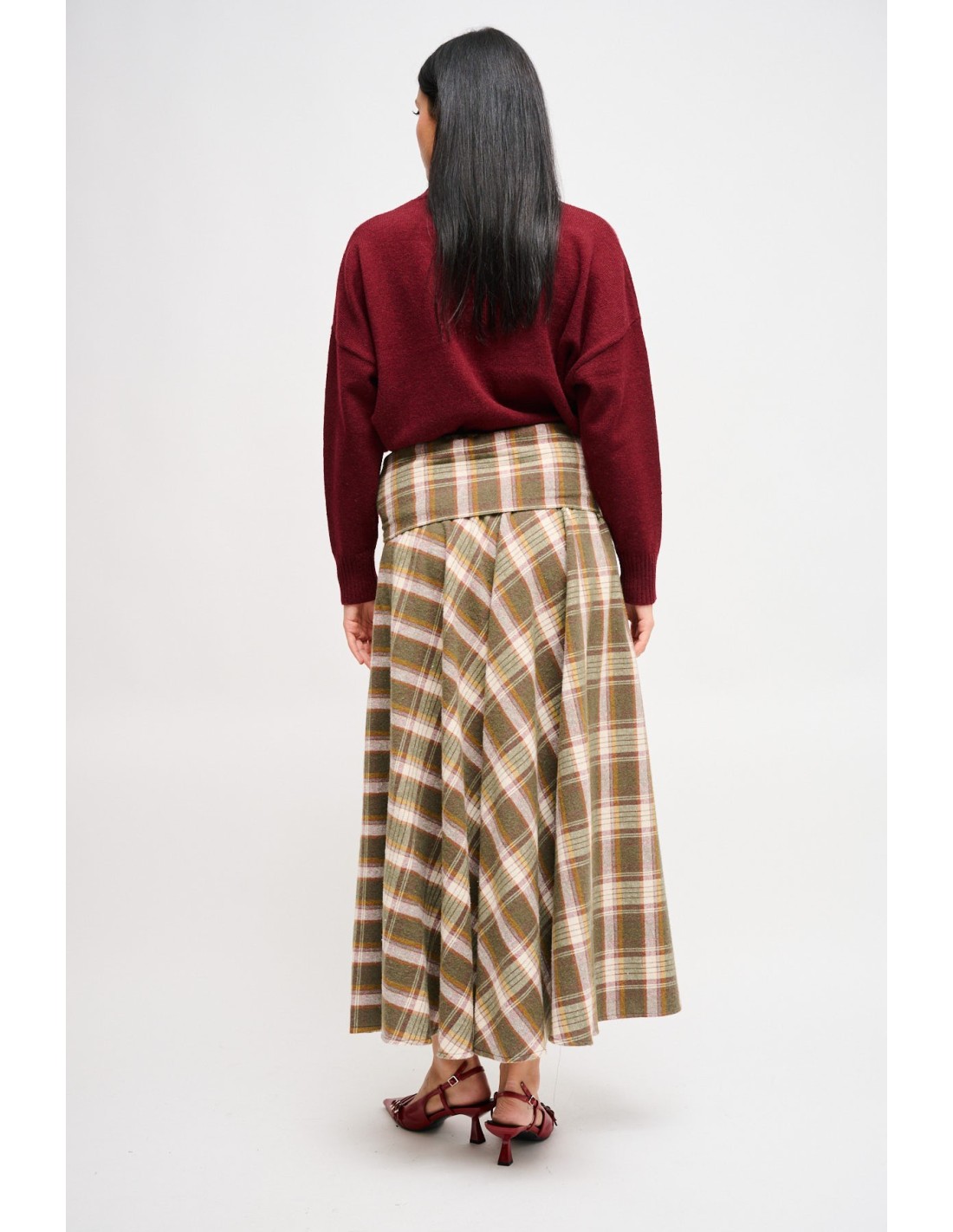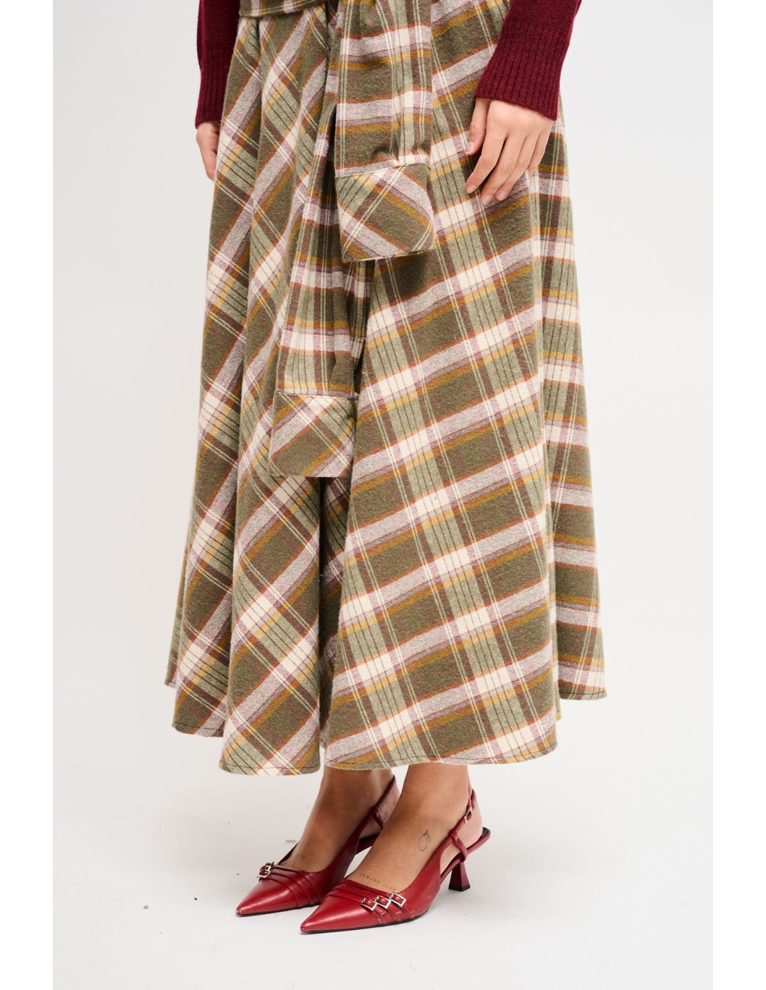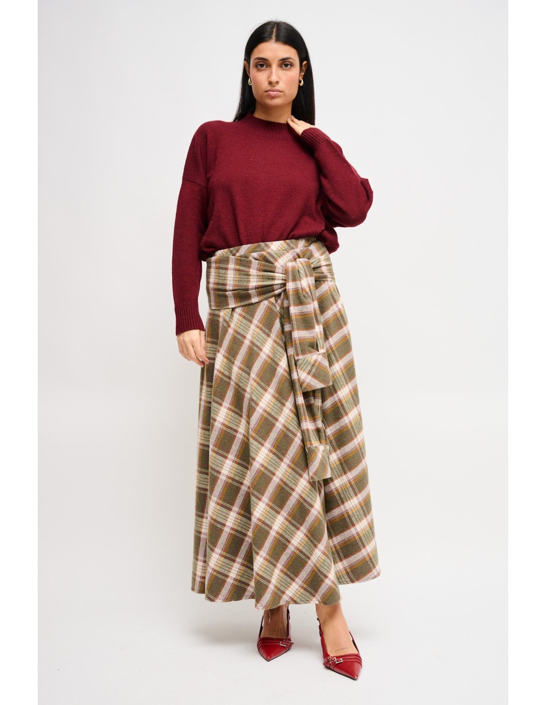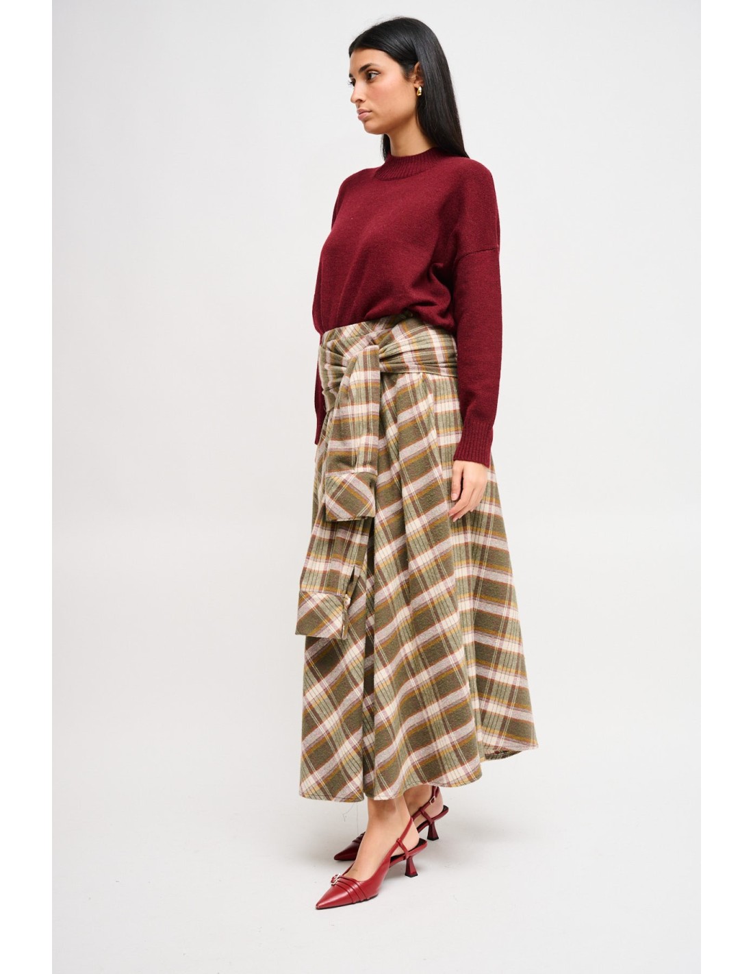 Saia longa Maryley em suave flanela tartan, de cintura alta e corte evasé que alonga a silhueta. O nó frontal com efeito "malha na cintura" confere um toque urbano e realça o ponto da cintura. Perfeita do trabalho ao fim de semana com botins ou décolleté.