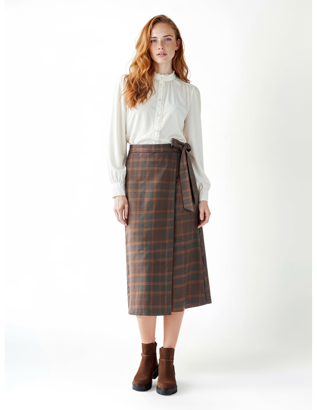 Rinascimento assina uma saia midi envelope com um corte suave e feminino, que valoriza a silhueta. Tecido xadrez de toque compacto e confortável. Fita lateral para atar e painel sobreposto que cria um movimento elegante. Versátil para escritório e uso diário, perfeita com botas ou slingback.