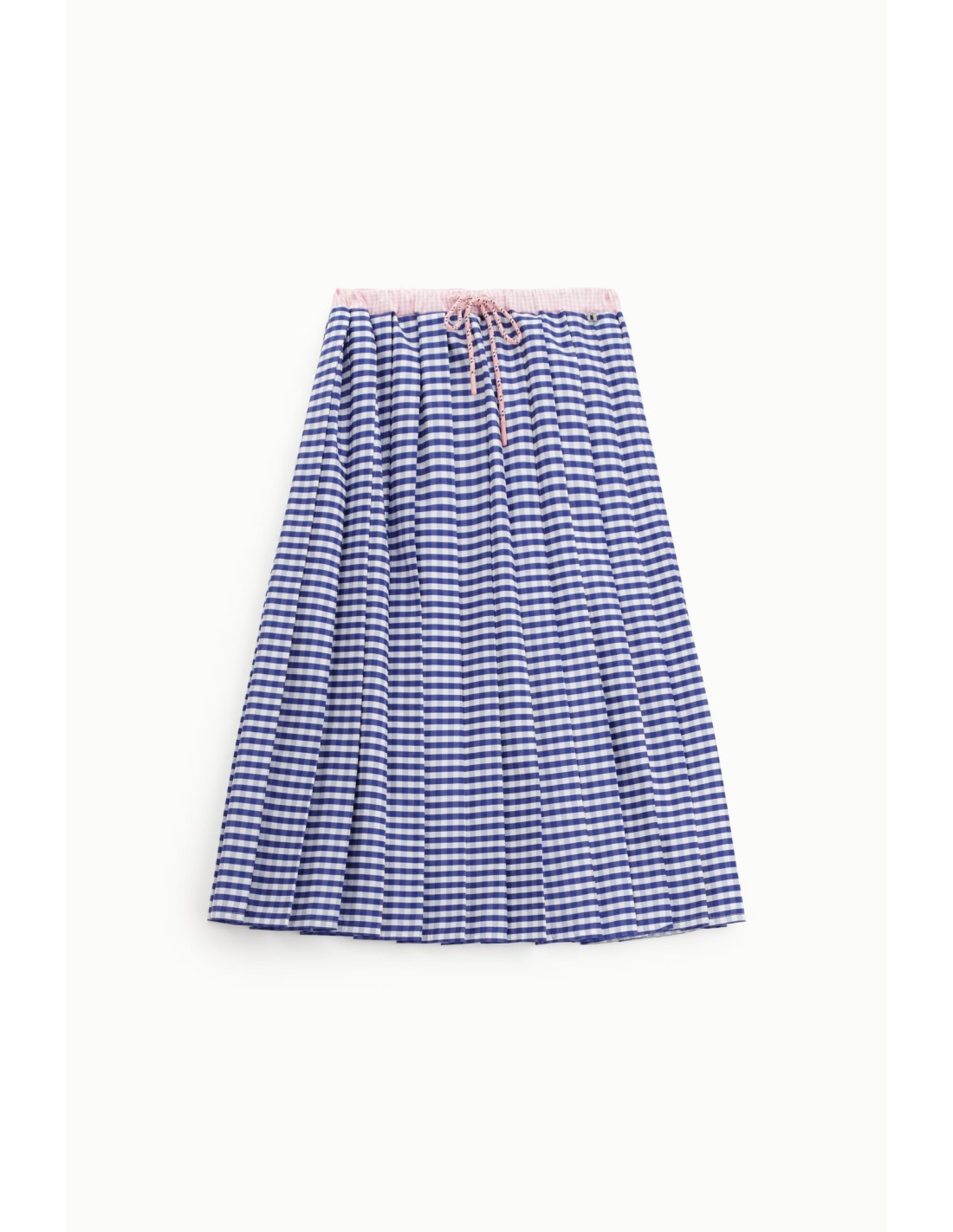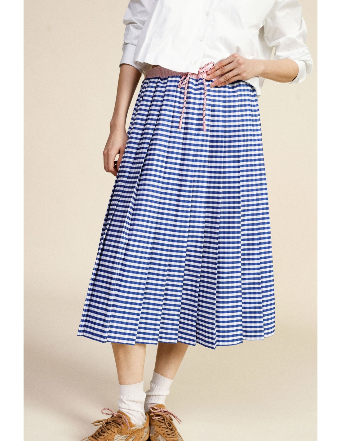 A saia midi de cintura alta com padrão aos quadradinhos traz imediatamente um toque divertido aos teus looks do dia a dia. O cordão ajustável na cintura e as pregas bem definidas tornam-na confortável e versátil, perfeita para passar com descontração dos passeios na cidade aos encontros entre amigas.