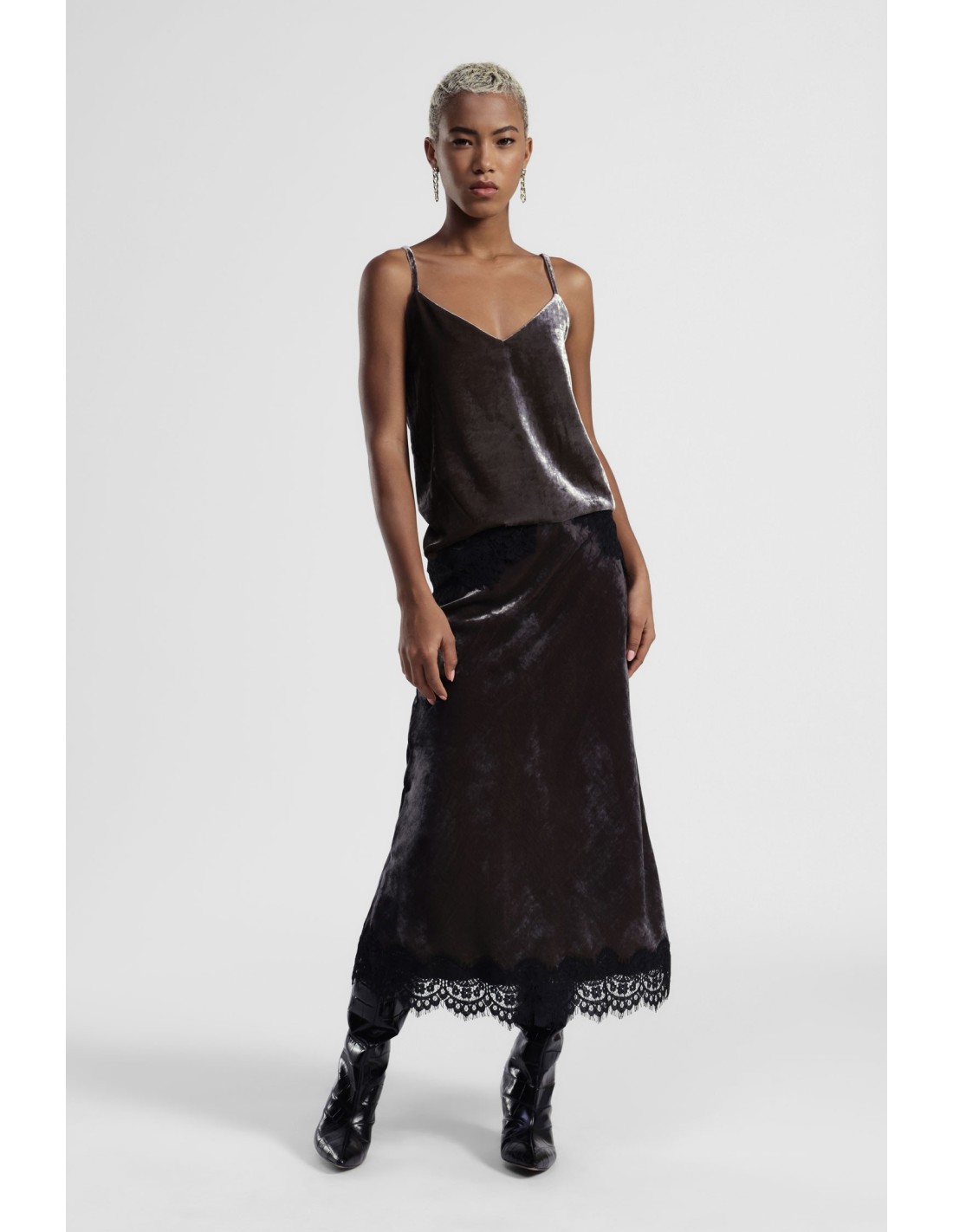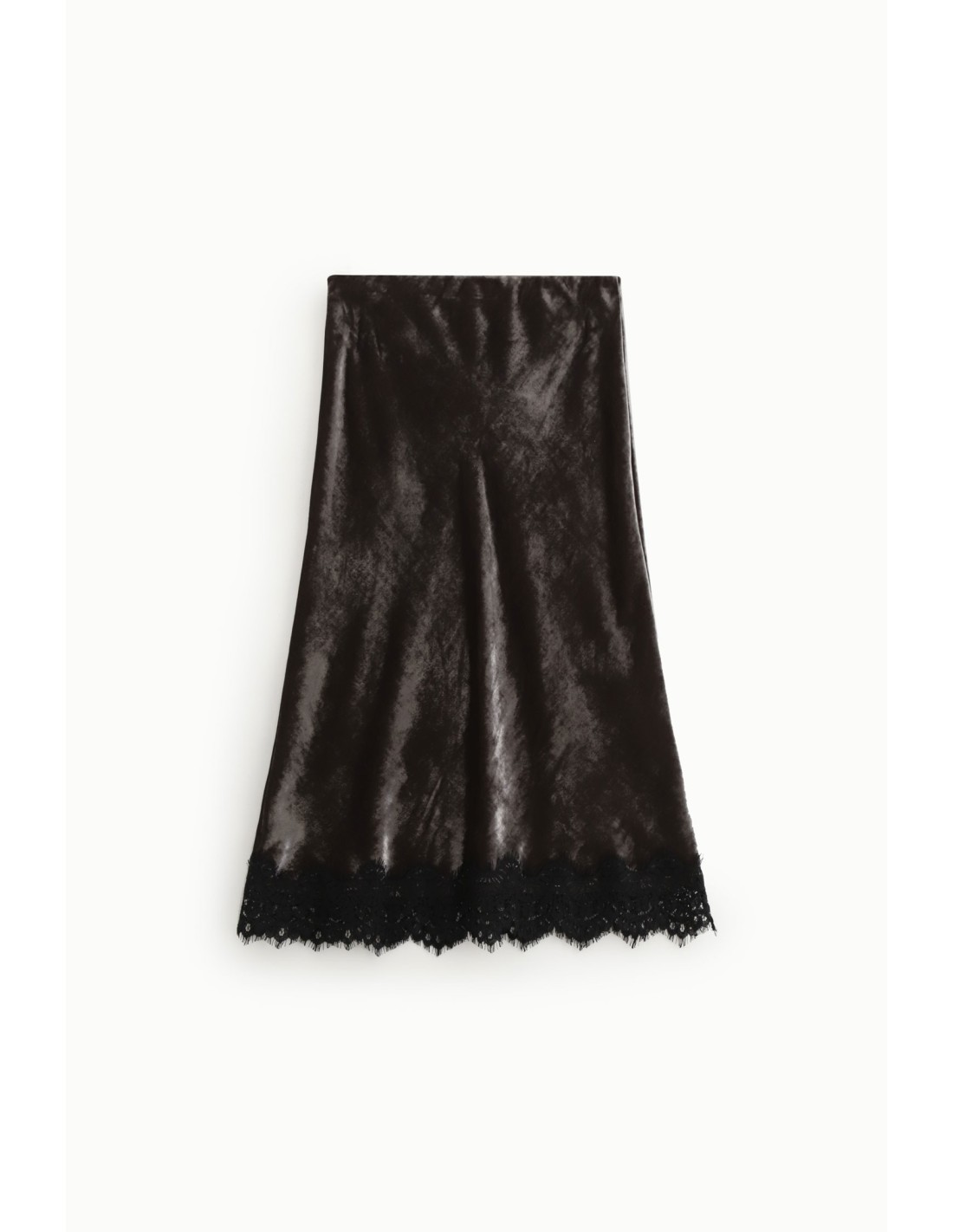 Deixe-se conquistar por esta saia midi com um refinado efeito veludo, que envolve com a sua linha fluida e valoriza cada movimento. A borda em renda confere um toque delicado e original, perfeito para dar personalidade até às combinações do dia a dia. Ideal tanto para o dia como para a noite.