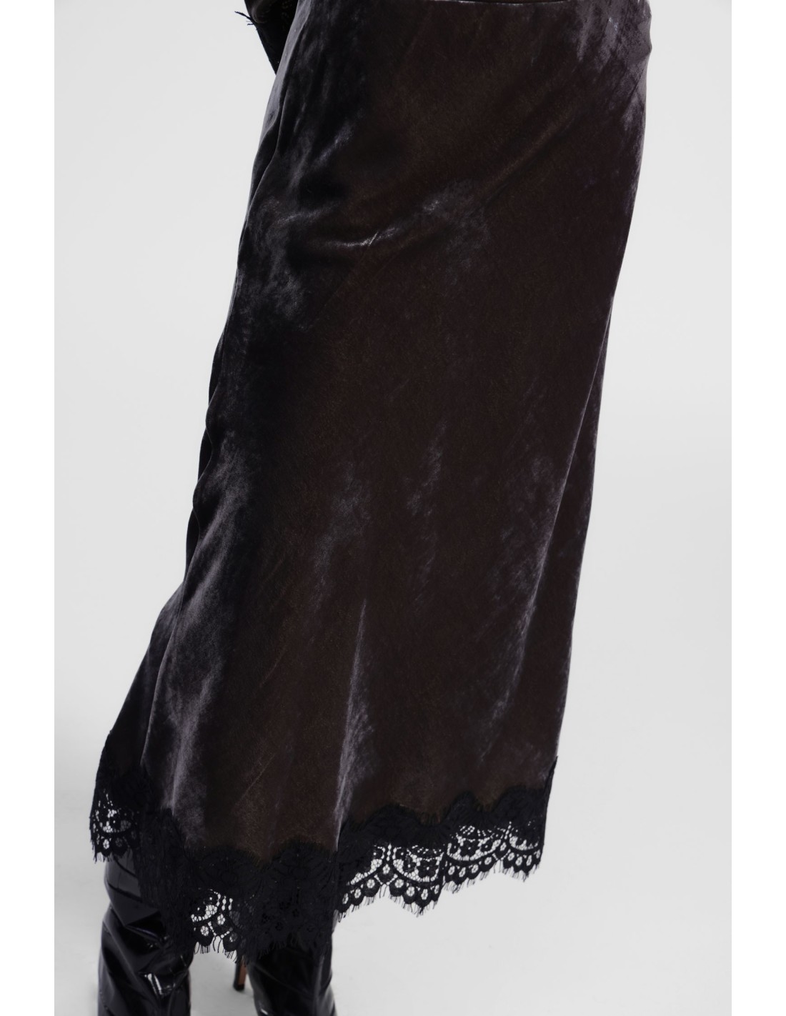 Saia midi efeito veludo com borda em renda