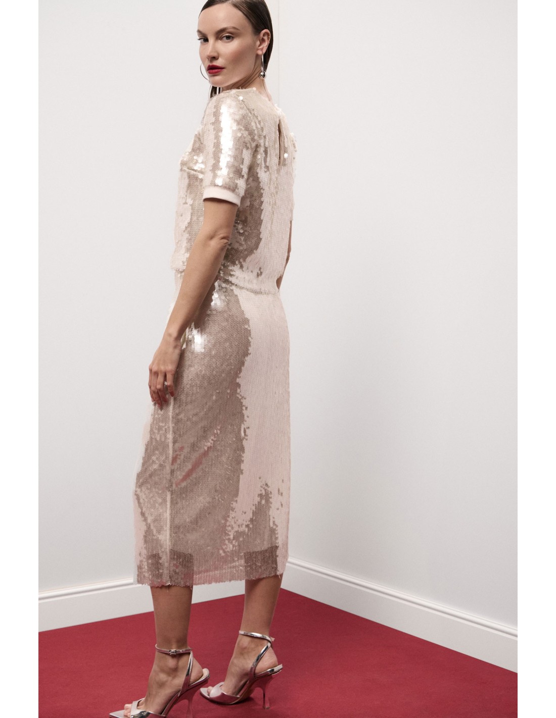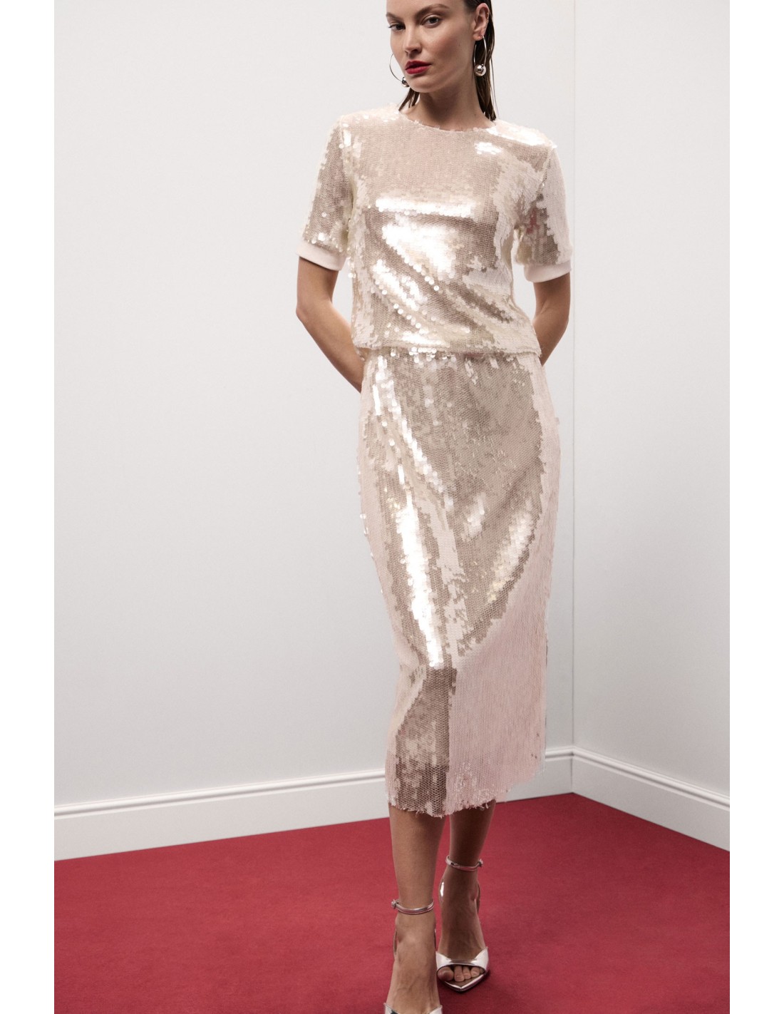 Esta saia midi de cintura alta, inteiramente coberta de lantejoulas, confere um toque brilhante e sofisticado a qualquer look. A linha reta valoriza a silhueta feminina, enquanto o comprimento versátil a torna perfeita tanto para ocasiões especiais como para noites em que queres sentir-te luminosa. Uma peça distintiva para quem aprecia a feminilidade e os detalhes luminosos.