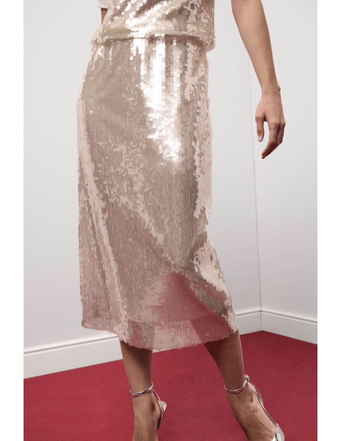 Saia midi de lantejoulas, cintura alta