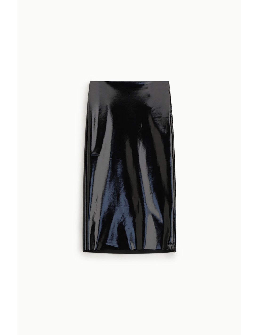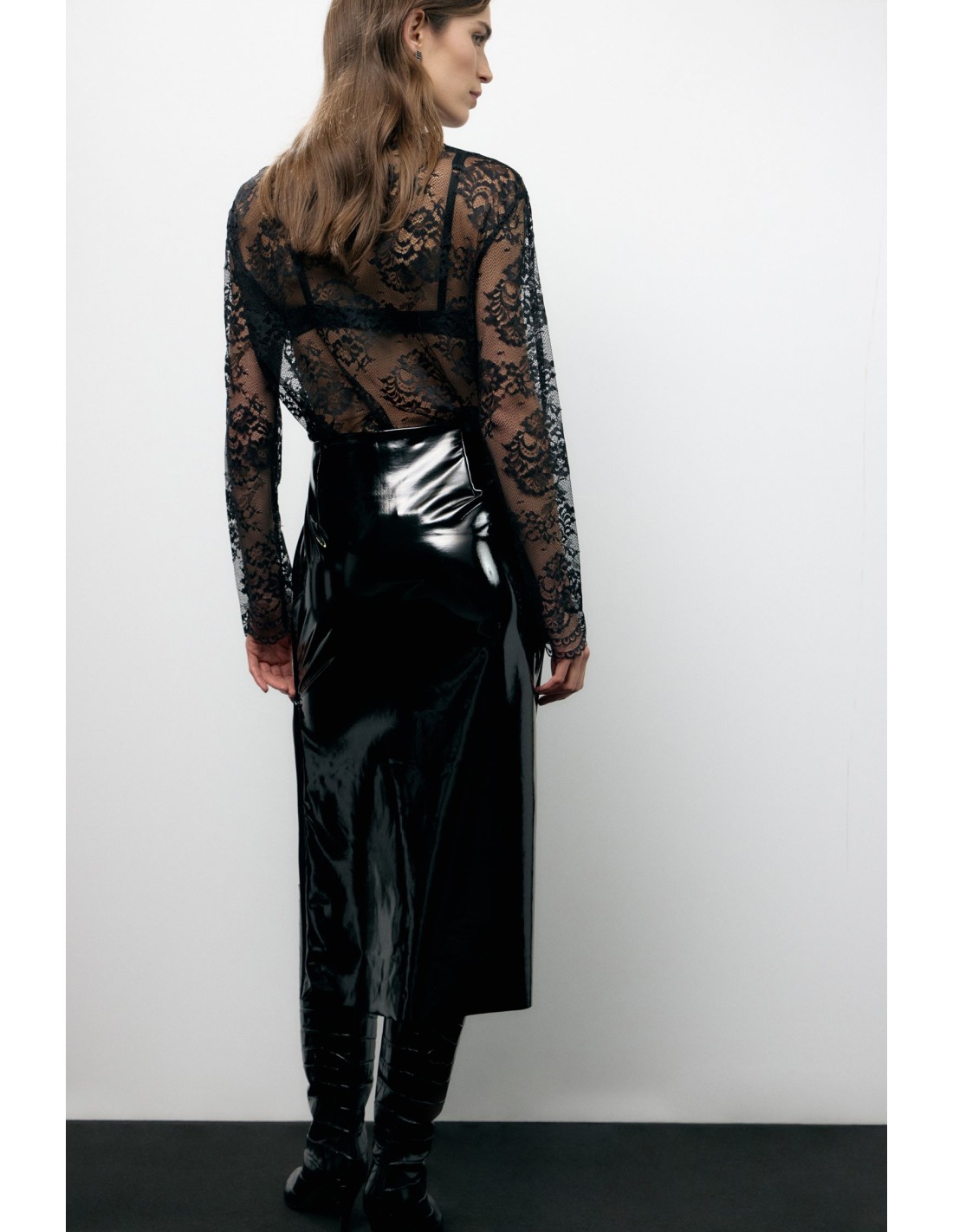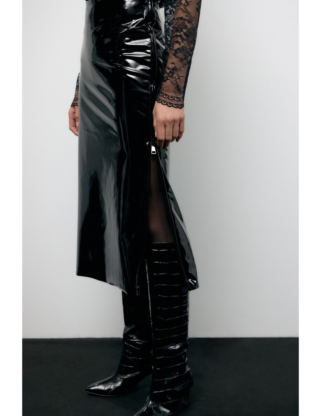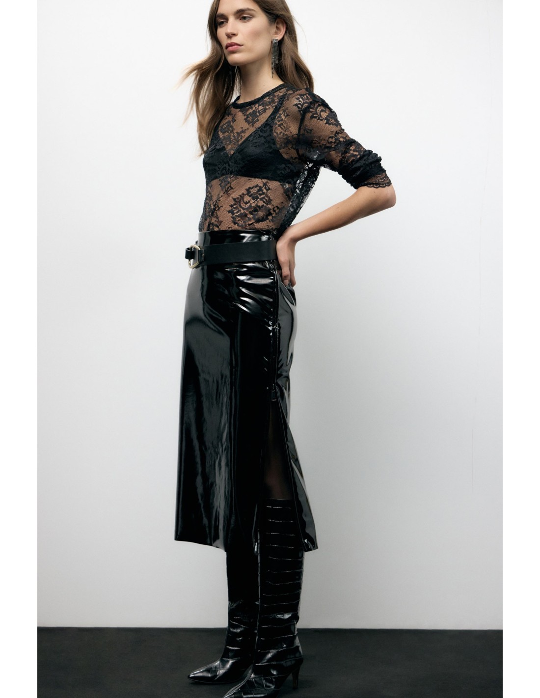 Deixe‑se conquistar pela saia midi de cintura alta, enriquecida por um acabamento brilhante e por uma fenda lateral que confere movimento e personalidade. O corte justo e o cinto largo com fivela acrescentam um toque marcante, perfeito para quem procura um estilo original para usar todos os dias sem renunciar à feminilidade.
