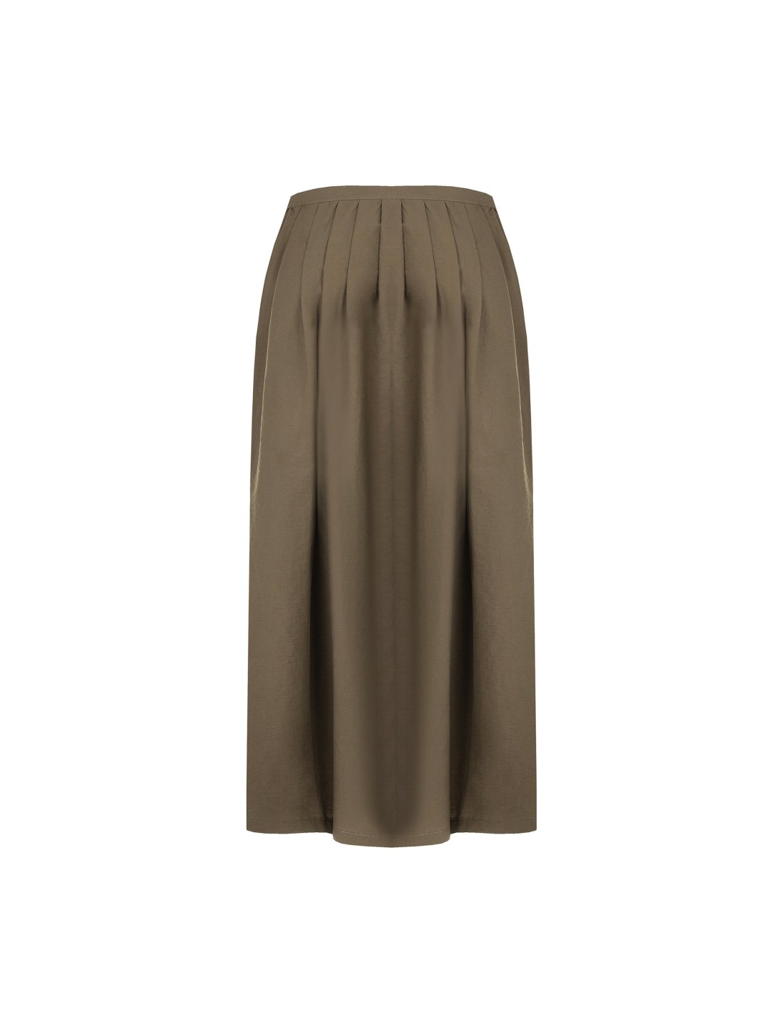 Linha longa e fluida com corte suave, pensada para acompanhar os movimentos com leveza. O tecido de textura lisa e toque confortável realça a silhueta, enquanto as pregas na cintura e o pequeno logo metálico acrescentam um toque sofisticado. Perfeita para o escritório, para o dia a dia e para aperitivos.
