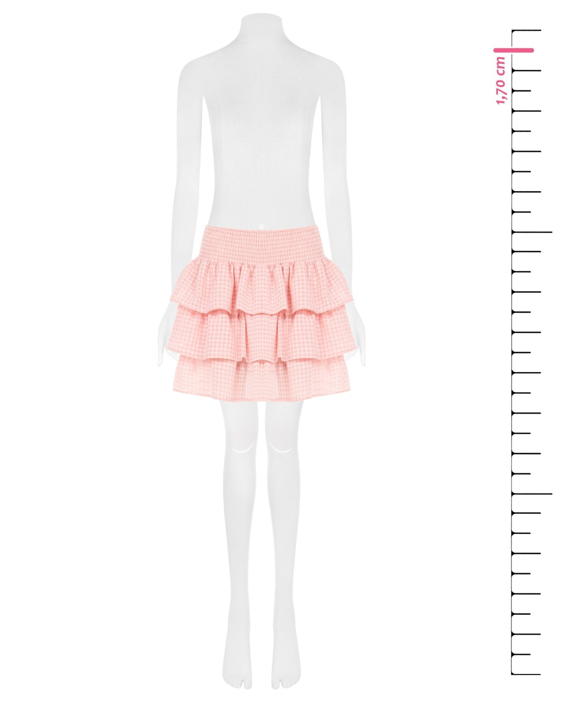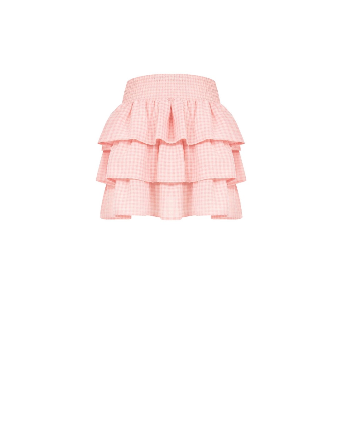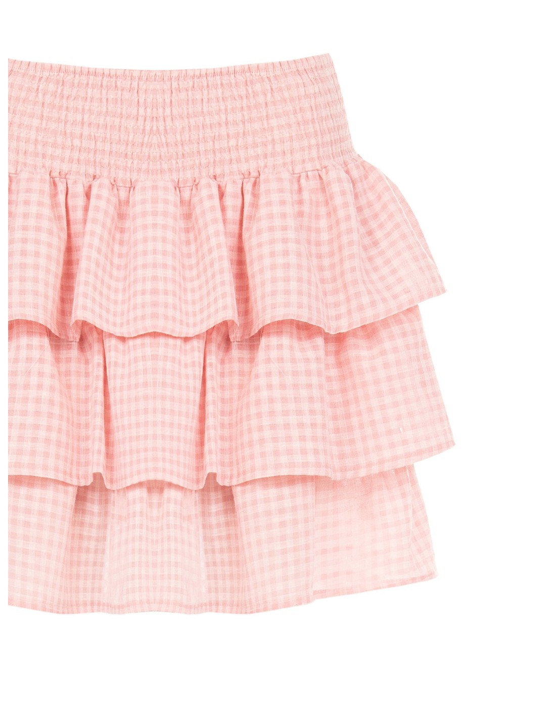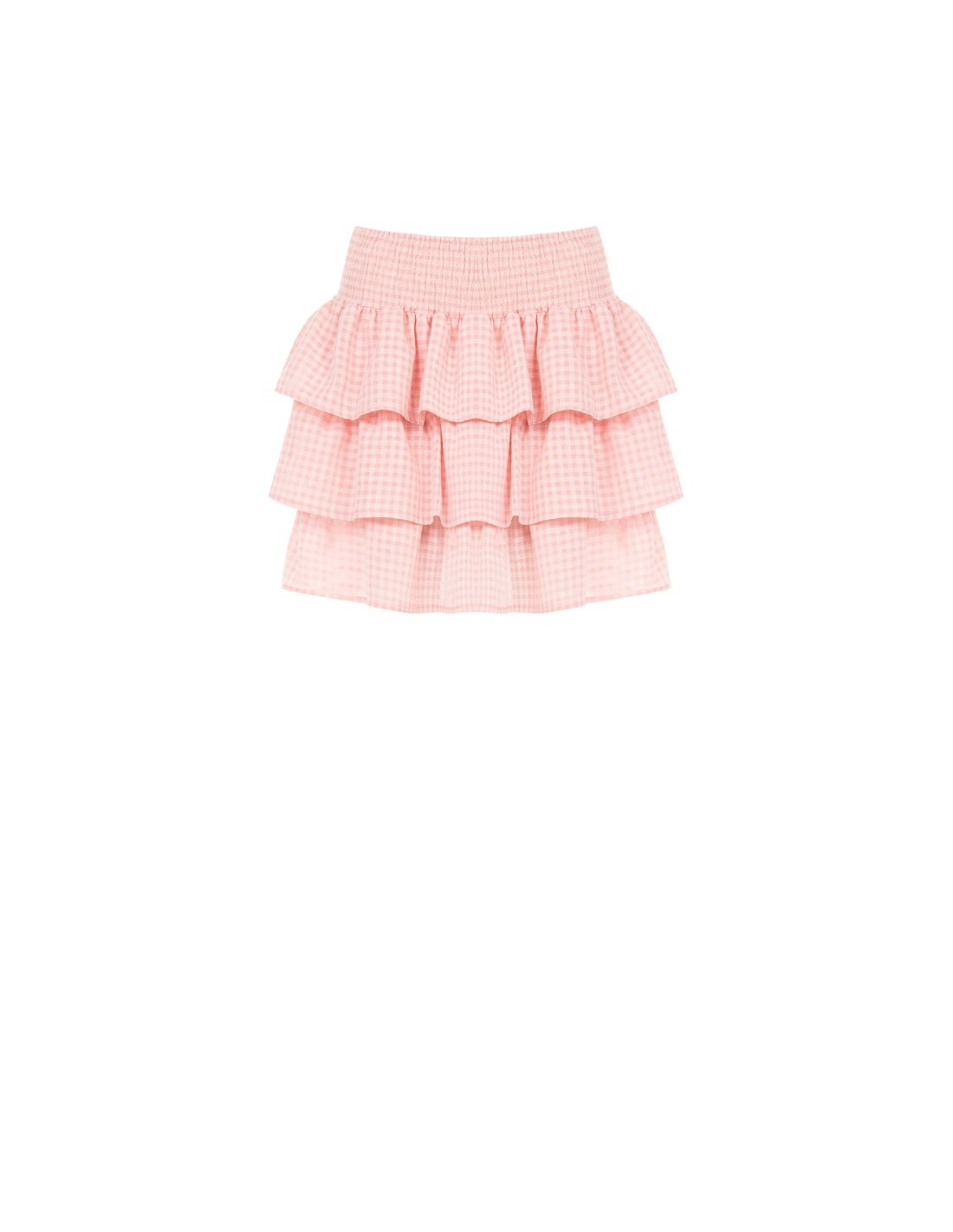 Modelo curto com ajuste macio e leve, em tecido fresco com textura vichy. A cintura alta elástica envolve com conforto, enquanto as folhos em camadas conferem movimento e uma silhueta feminina. Perfeita para tempos livres, fins de semana fora de casa e looks do dia a dia mais cuidados.