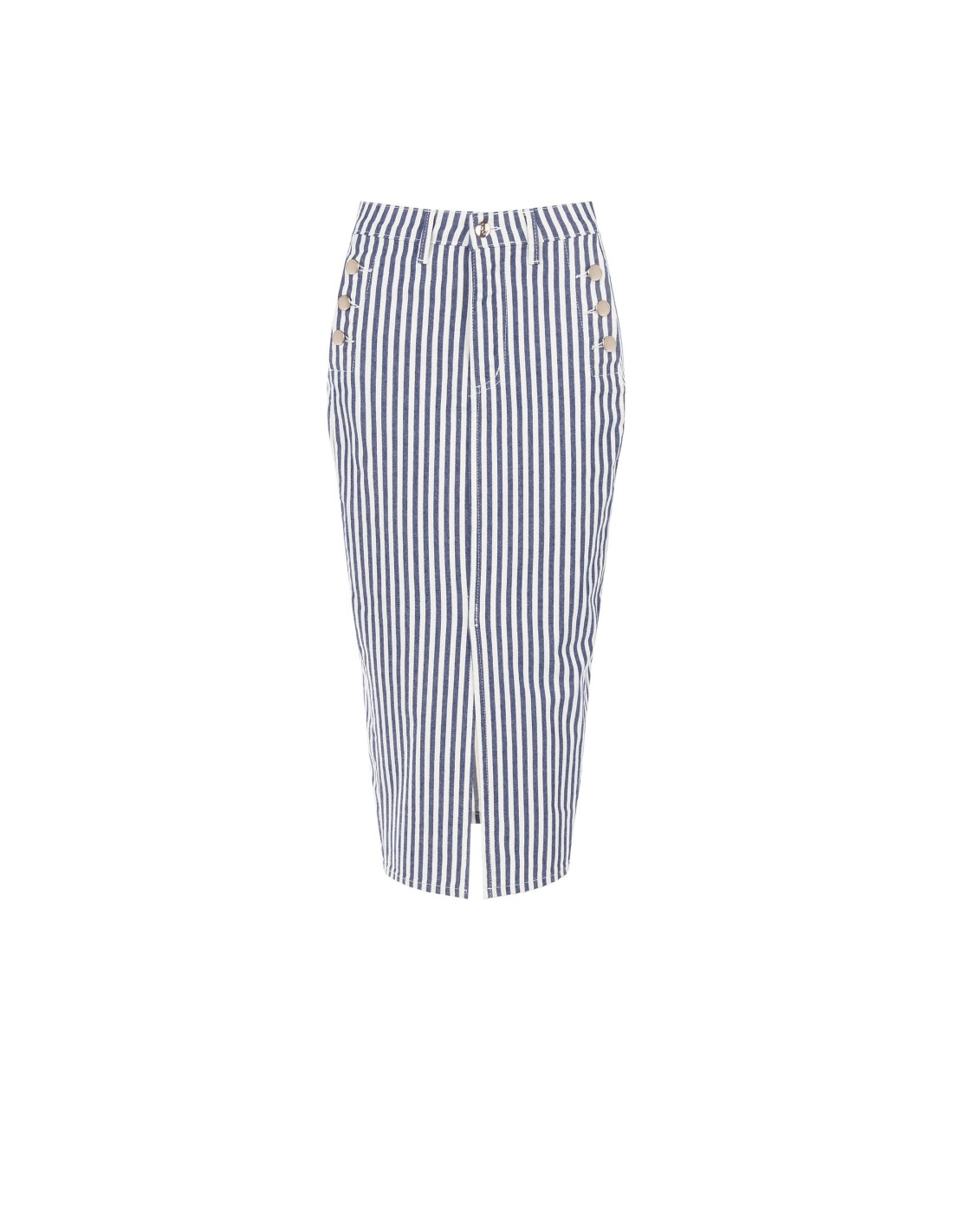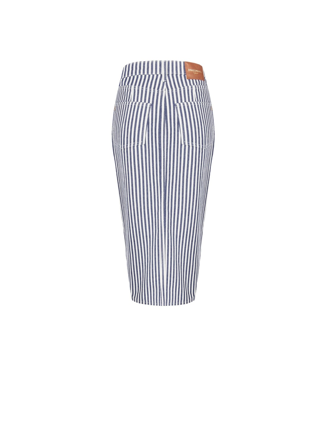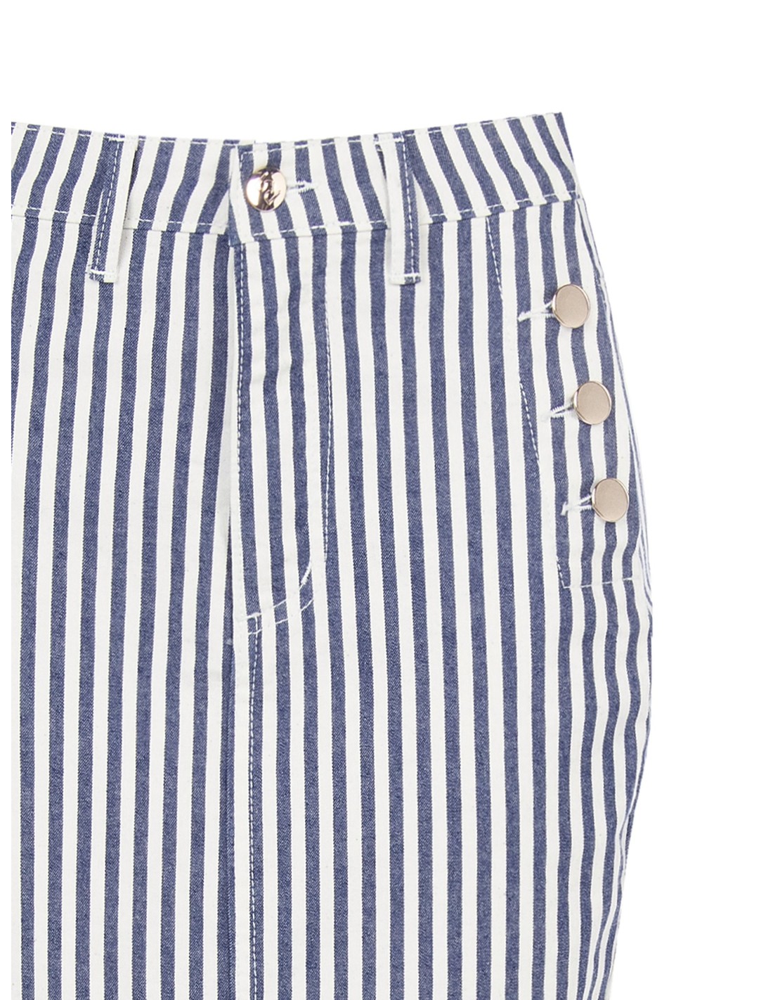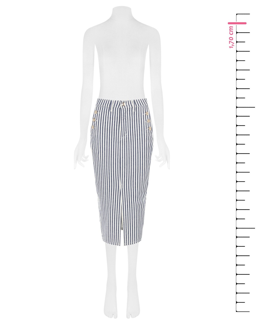 Midi de corte envolvente que segue a silhueta com conforto, confeccionada em denim de algodão com textura riscada. Os botões decorativos laterais e a fenda frontal acrescentam carácter e liberdade de movimento. Perfeita para o escritório, lazer e looks do dia a dia cuidados.