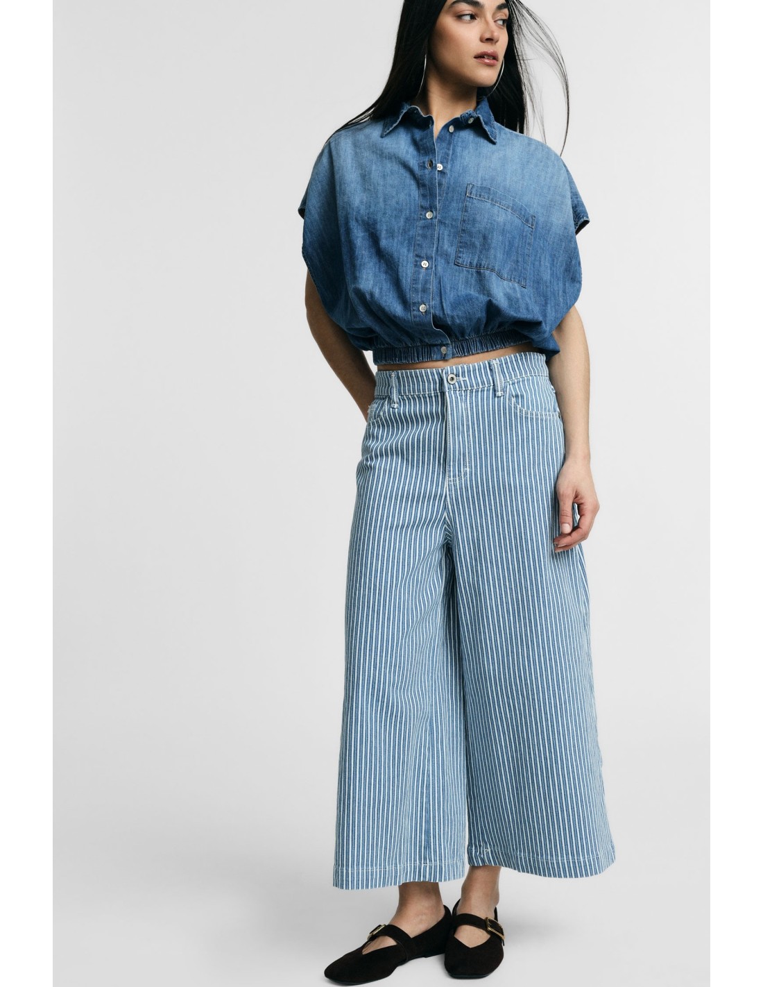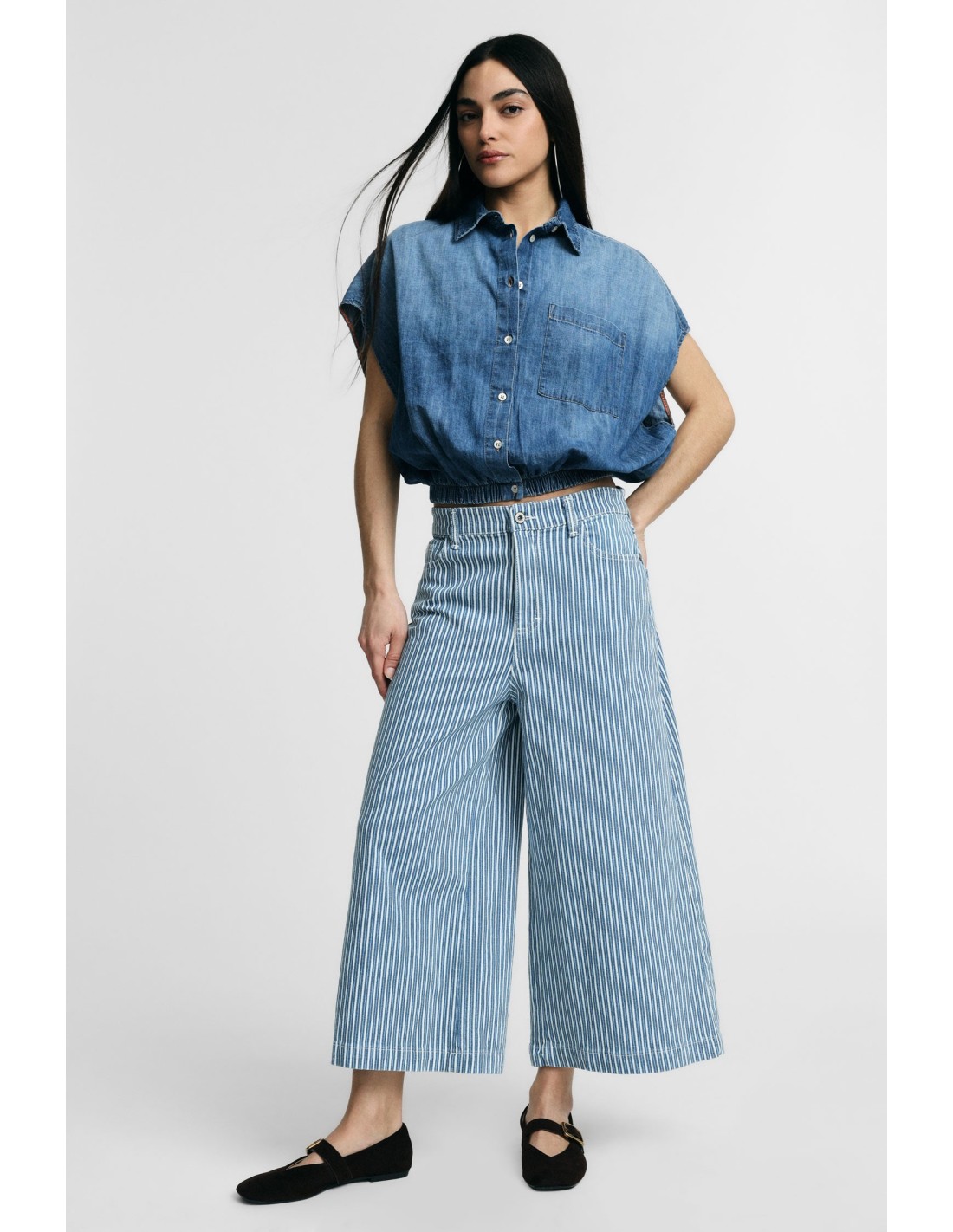 Vive a cidade com estes jeans às riscas de corte extra amplo e comprimento cropped, perfeitos para criar looks criativos todos os dias. A cintura regular e os bolsos funcionais tornam-nos confortáveis e versáteis para qualquer ocasião, do brunch com as amigas às deslocações de metro.