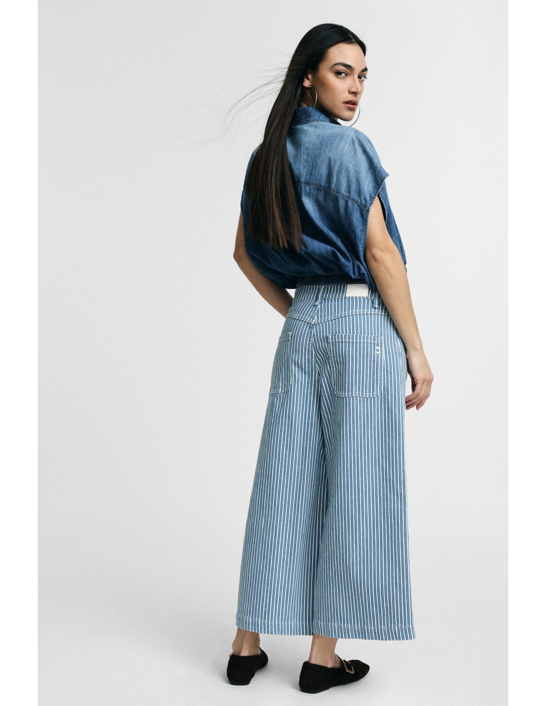 Jeans às riscas de perna larga cropped