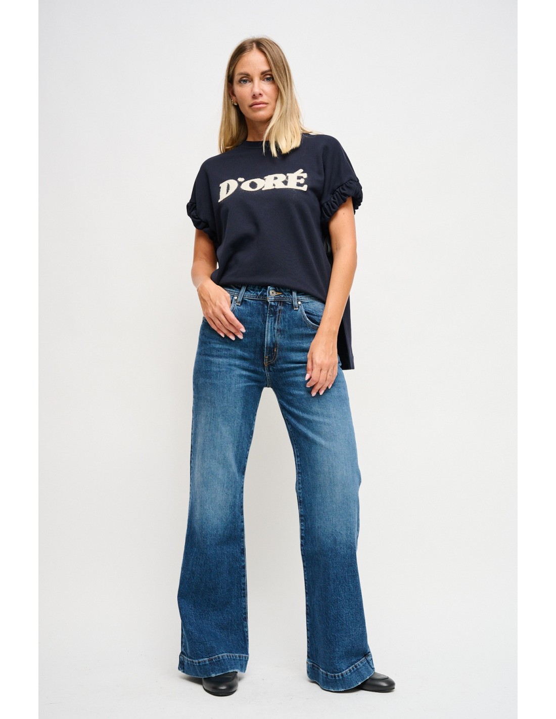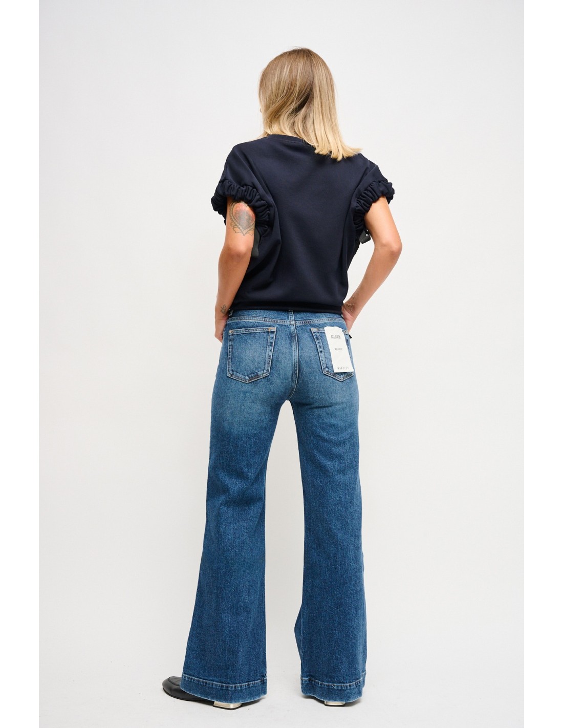 Maryley propõe um denim de perna larga e cintura média: cai suave, alonga a silhueta e garante conforto o dia todo. Algodão com uma ligeira percentagem de stretch e toque macio, efeito used. Detalhes: costuras em contraste, bolsos traseiros modelados. Perfeito para o dia a dia e para a casual Friday com blazer ou camisola minimal.