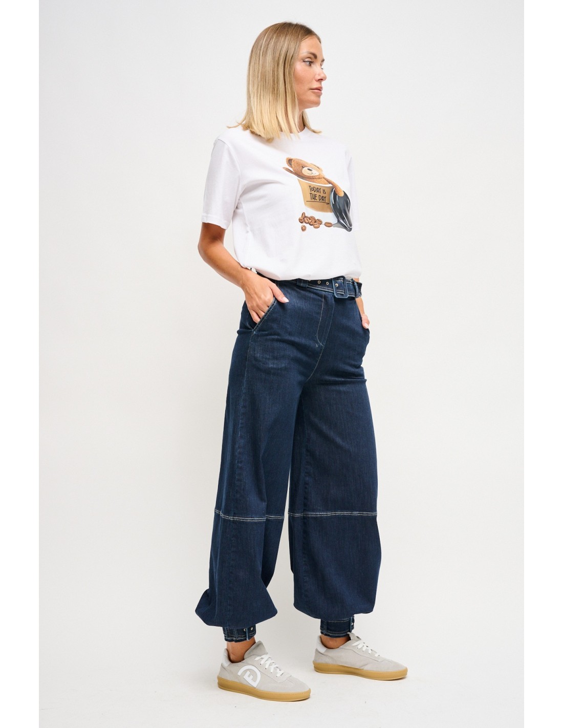 Maryley apresenta umas calças largas de cintura média, com um corte relaxado que alonga sem apertar. Denim macio com toque suave e costuras à vista. Cinto coordenado e punhos na bainha reguláveis para alterar o volume. Perfeitas para o dia a dia e tempo livre, adaptam-se também a um casual Friday com blazer.