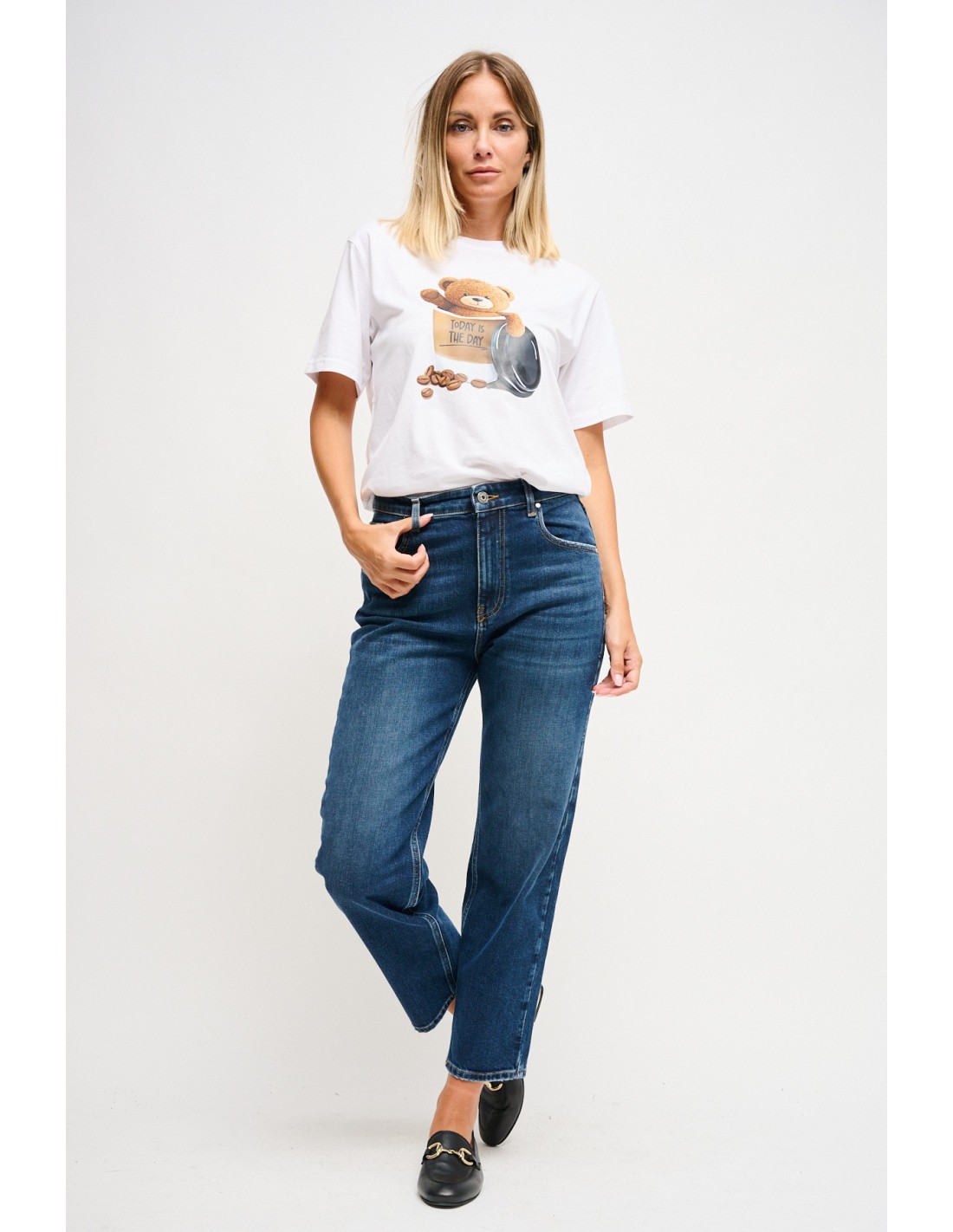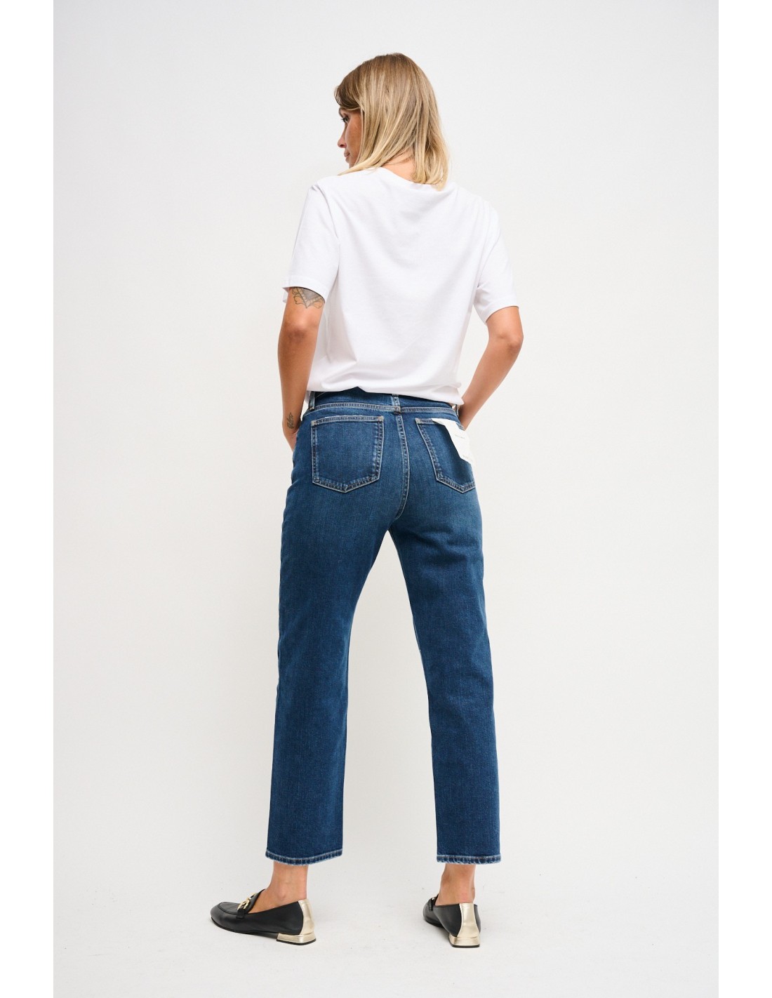 Maryley assina um denim de cintura média com perna recta e corte amplo e suave: acompanha a silhueta sem apertar. Tecido de algodão com ligeiro stretch e toque macio, lavagem desgastada. Detalhes: pespontos contrastantes, fecho com botão com logótipo. Versátil do dia à noite: perfeito para o dia a dia e para Casual Friday.