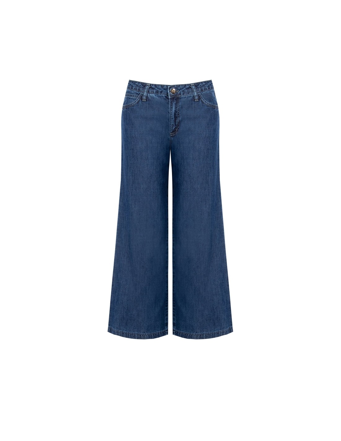 Calças em ganga leve de corte amplo e fluido, pensadas para alongar a silhueta com naturalidade. A textura macia acompanha os movimentos, enquanto o fecho com botão-joia e os bolsos de corte clássico adicionam personalidade. Perfeito para o dia a dia e para o escritório.