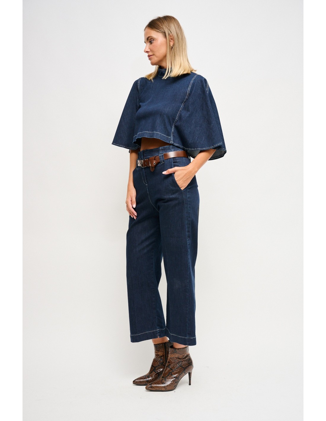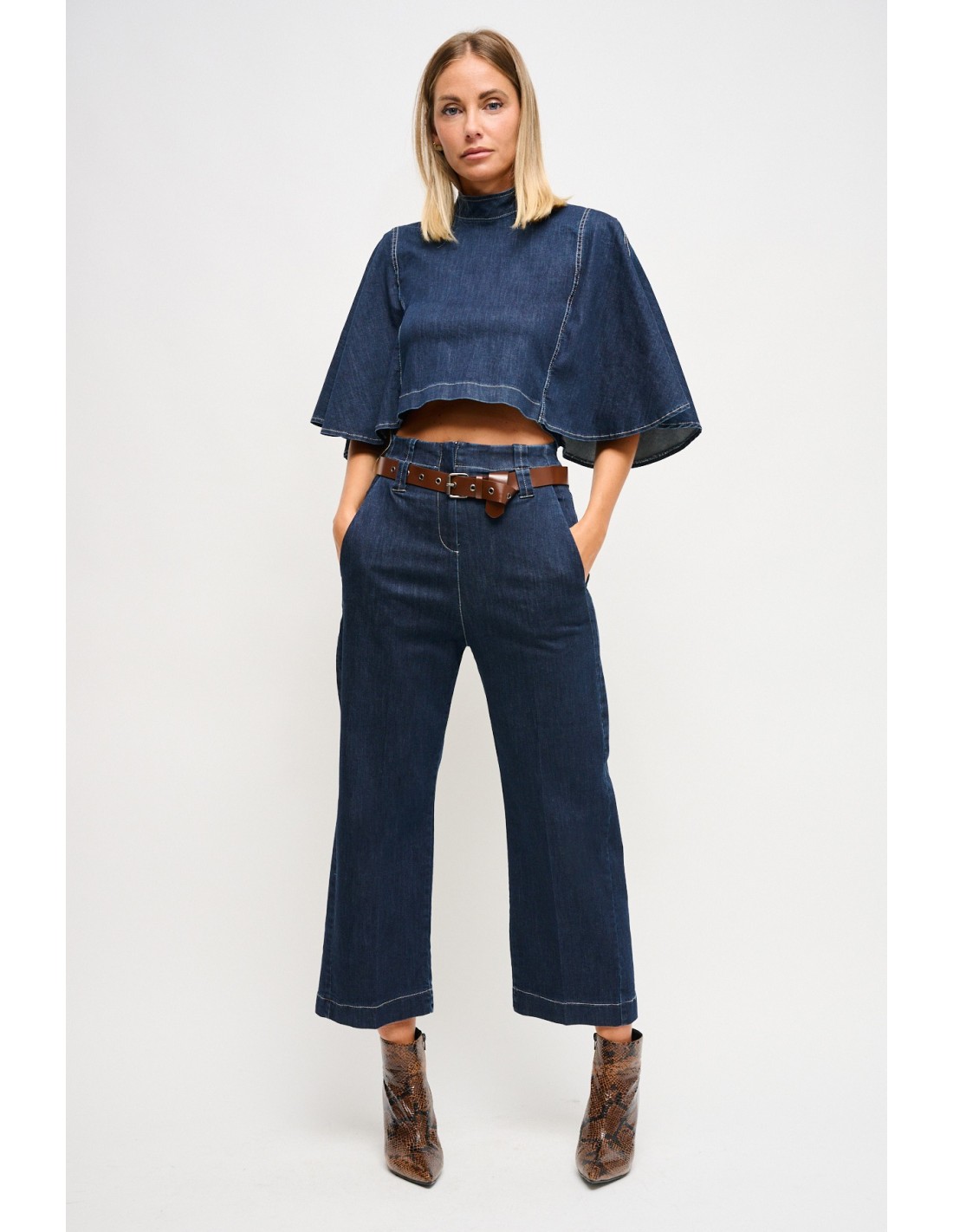 Maryley apresenta umas calças de cintura alta com corte direito e suave que alongam a silhueta. Denim leve e confortável, com costuras contrastantes. Cinto removível com ilhós e bolsos laterais para um toque prático. Perfeitas do escritório ao aperitivo, adaptam-se a blazer ou top cropped.