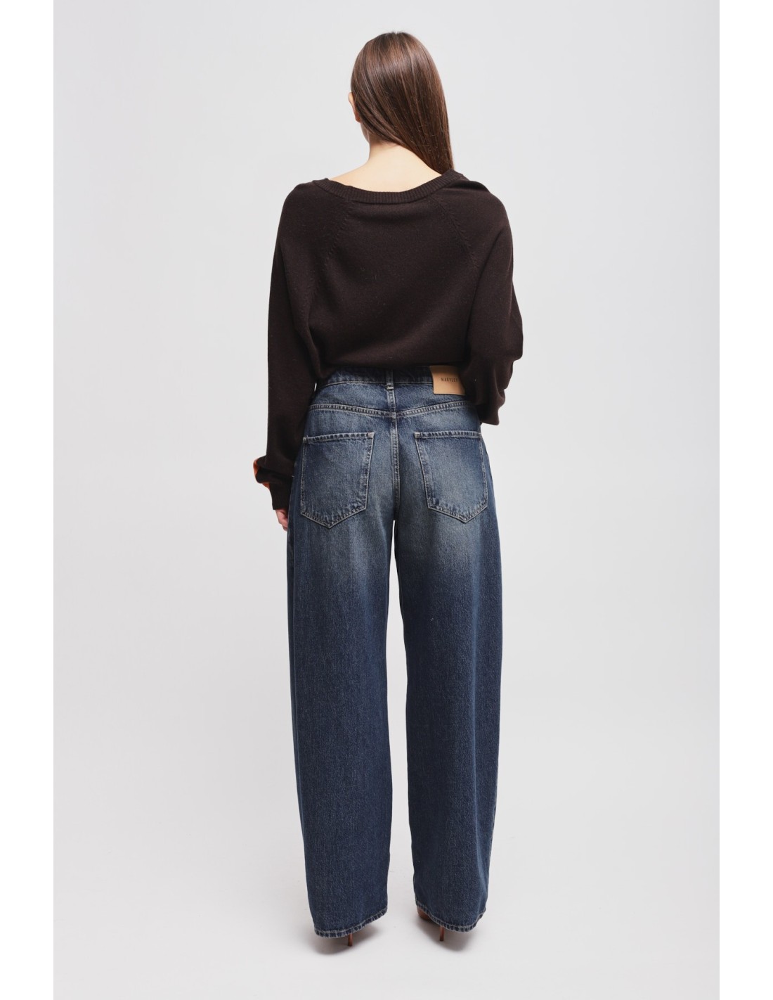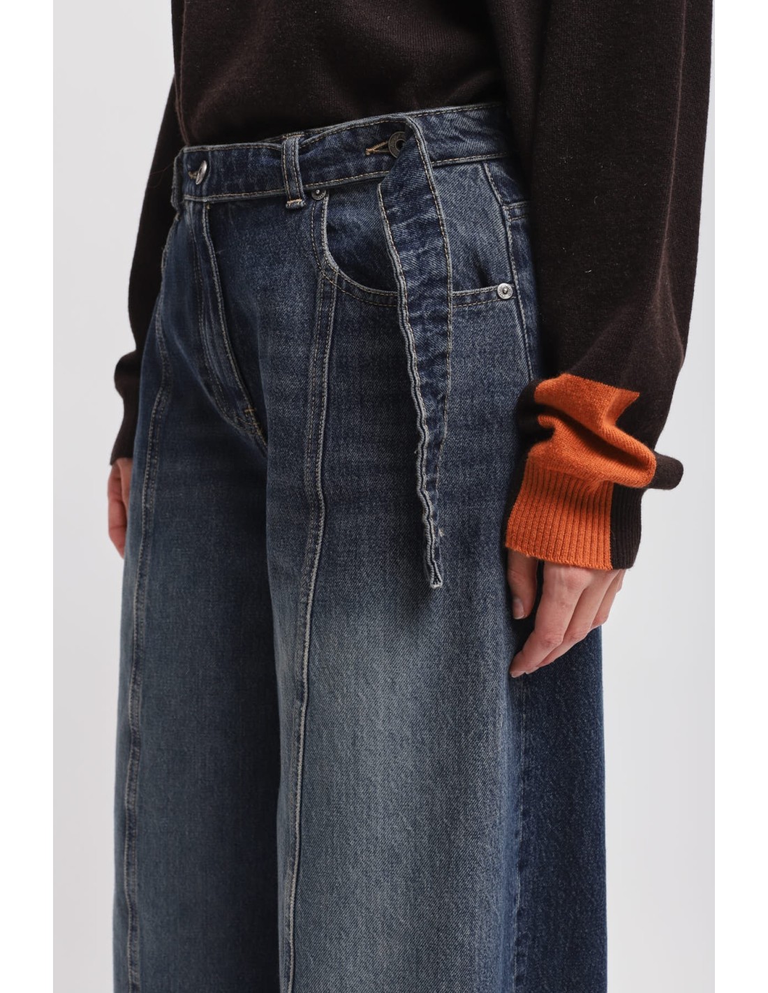 Maryley reinterpreta o denim com uma silhueta ampla e macia que afina sem apertar. Algodão resistente com toque suave e lavagem desgastada. Detalhes icónicos: costuras frontais verticais e cinto falso com franjas aplicado. Perfeitos com blazer para o escritório informal ou com sandálias para o tempo livre.