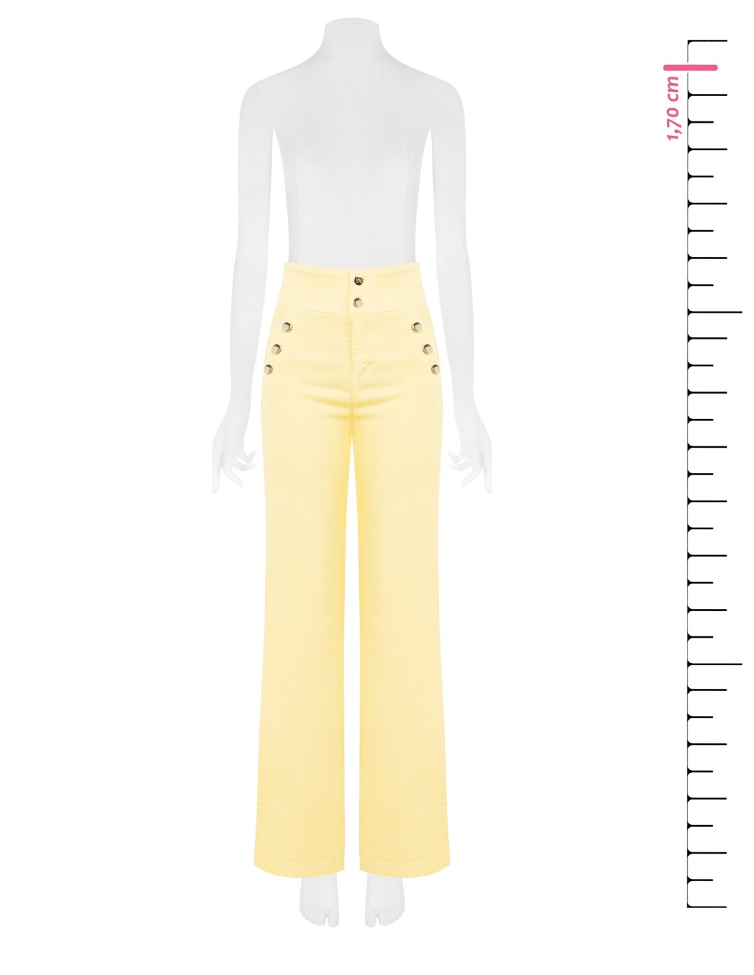 Calças em denim stretch com corte recto e efeito alongador, com faixa alta na cintura que valoriza a silhueta e acompanha os movimentos com conforto. Os botões tipo joia laterais e o fecho frontal acrescentam carácter. Perfeitas do escritório ao dia a dia mais cuidado.