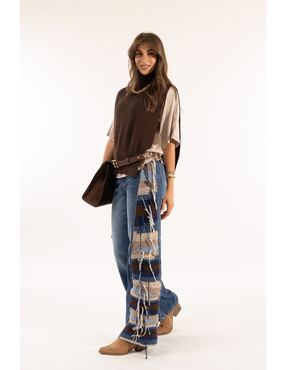 Kontatto reinterpreta o denim com uma silhueta evasê que alonga e valoriza. Algodão rígido com inserções de crochet laterais para um toque artesanal e franjas em movimento. Cintura média, fecho com fecho de correr e botão. Perfeitos para o tempo livre e para um aperitivo, acrescentam carácter a malhas macias e botins.