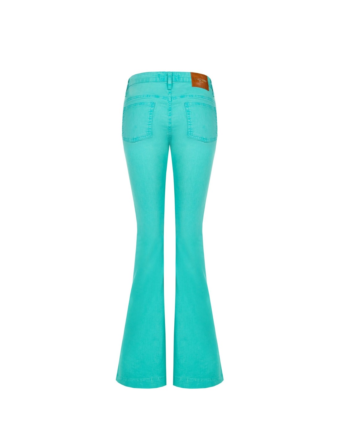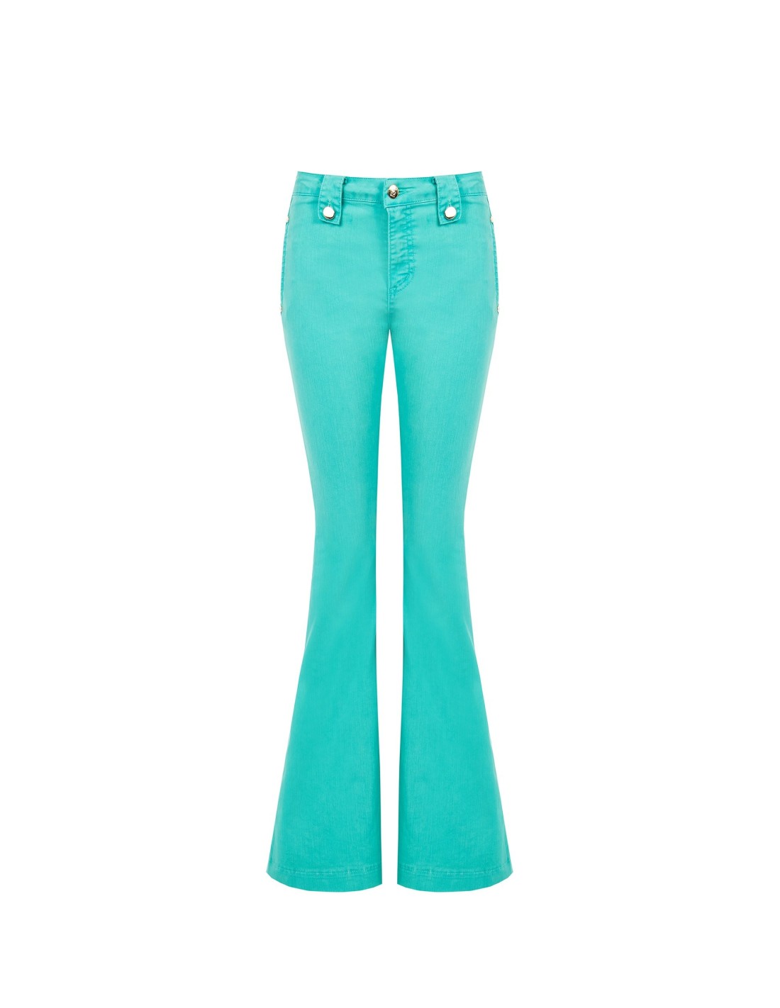 Calças em denim stretch de corte justo na perna e evasé na bainha, pensadas para alongar a silhueta com conforto. O tecido macio acompanha os movimentos, enquanto os passadores com botões bijou e o fecho frontal acrescentam um toque requintado. Perfeitas do escritório ao aperitivo.