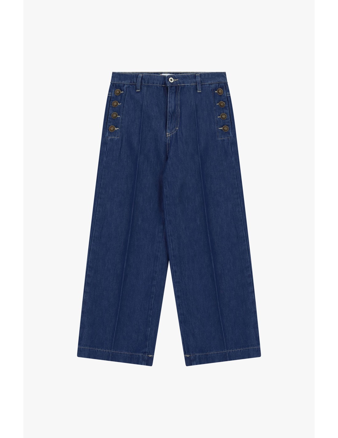 Corte amplo e reto para estes jeans de perna larga, enriquecidos com botões decorativos em ambos os lados da cintura. Passantes para cinto e costuras aparentes tornam o look dinâmico e imediatamente reconhecível. Ideais para combinar com ténis ou botins, para looks que mudam num instante ao longo do dia.