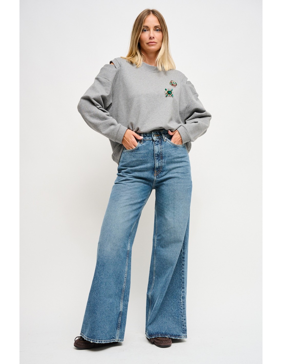 Maryley eleva o teu denim: calças de cintura alta com perna larga e bainha ligeiramente evasée para alongar a silhueta. Tecido em algodão rígido com aspeto vintage, costuras à vista e bainha desgastada. Fecho de correr e botão, bolsos traseiros moldados. Perfeitas para o dia a dia e para casual friday com blazer ou malhas macias.