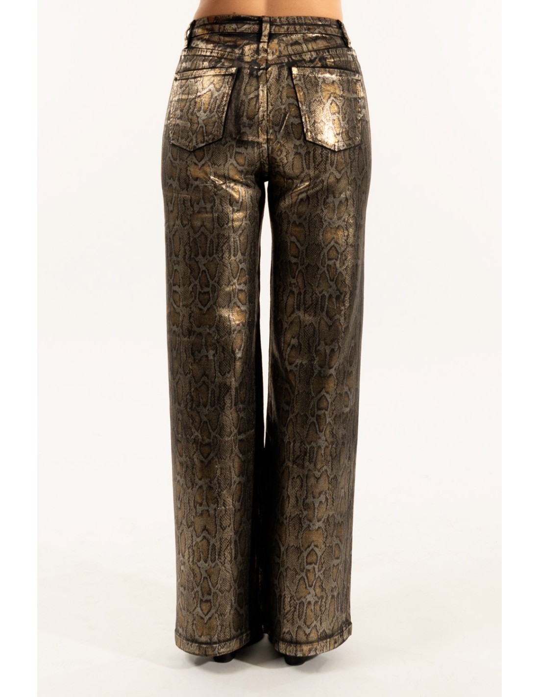 Calças de perna reta, cintura média e corte confortável que alonga a silhueta. Denim com acabamento laminado efeito pele de cobra, textura macia mas estruturada. Fecho de correr e botão, bolsos maxi na parte de trás. Perfeitas para noites e festas, também para conjugar com blazer para um look after‑office.