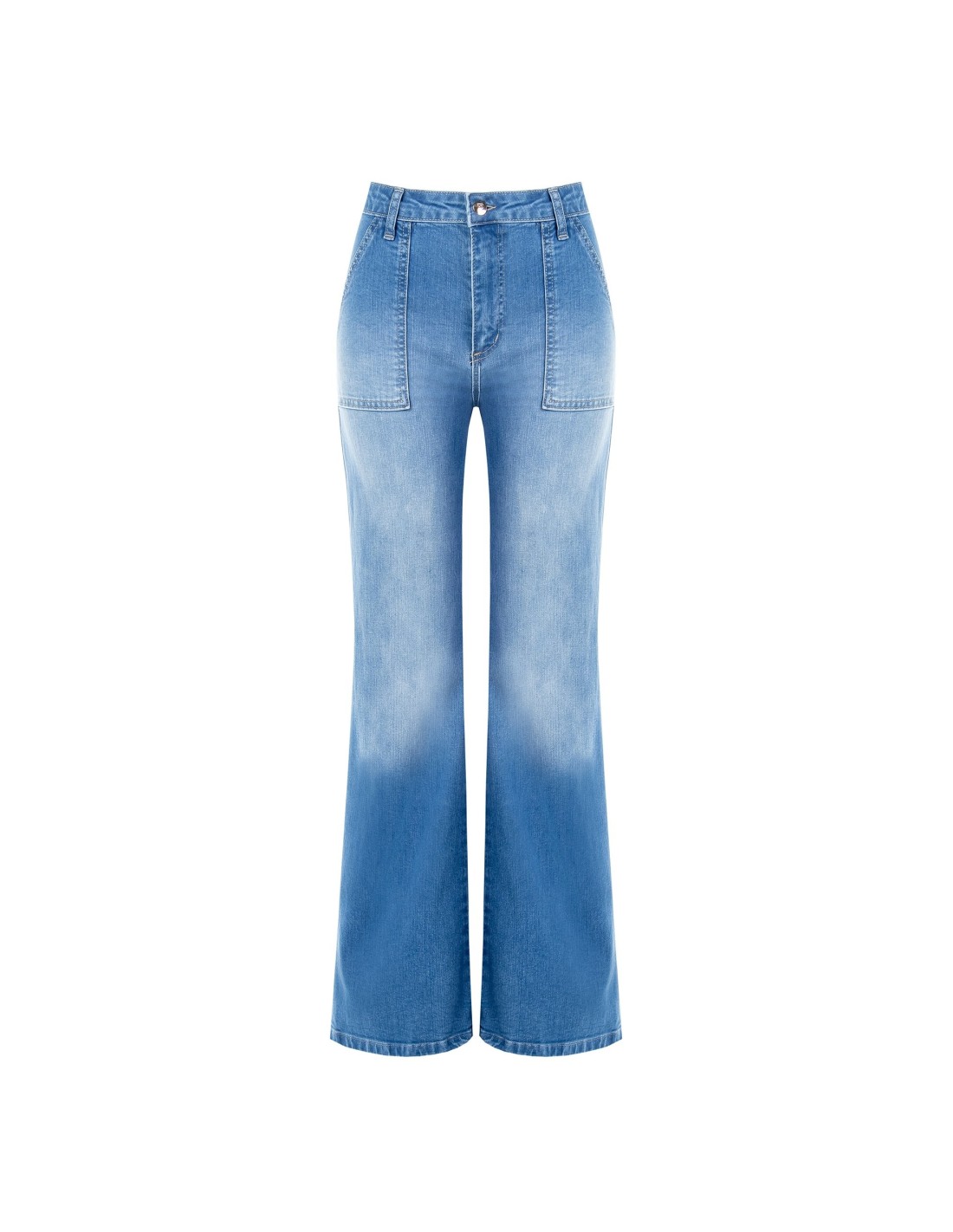 Calça em denim macio com uma ligeira componente elástica, de corte recto que acompanha a silhueta com conforto e alonga a figura. Os maxi bolsos aplicados à frente e o fecho com botão e zip acrescentam carácter. Perfeita do escritório ao tempo livre.