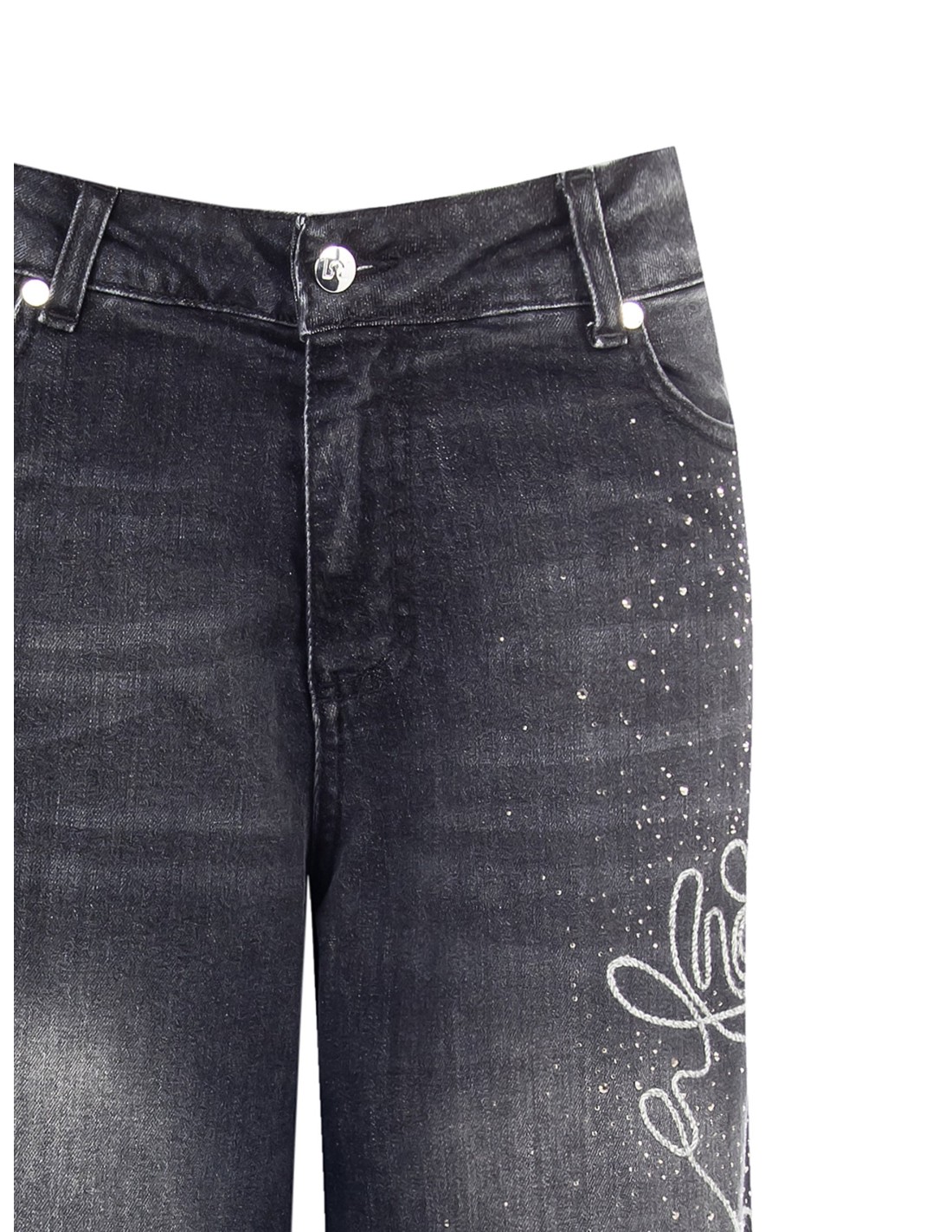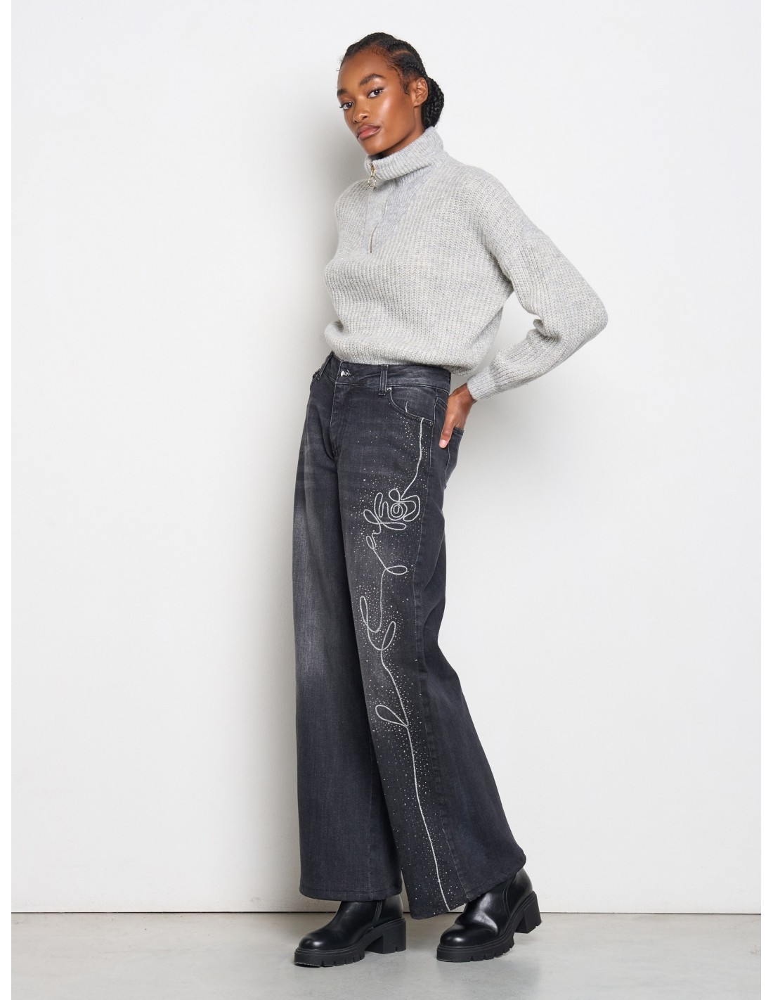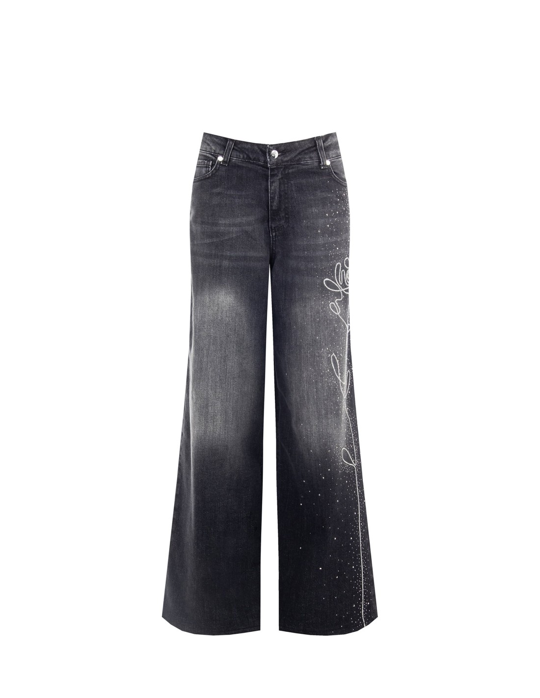 Rinascimento propõe um denim direito de perna larga: corte relaxado que alonga e garante conforto todo o dia. Algodão com uma ligeira percentagem de elastano, textura encorpada mas macia. Distintivos: bordado floral lateral com micro-strass e cintura com passantes e botão com logótipo. Perfeito para o dia a dia e aperitivos.
