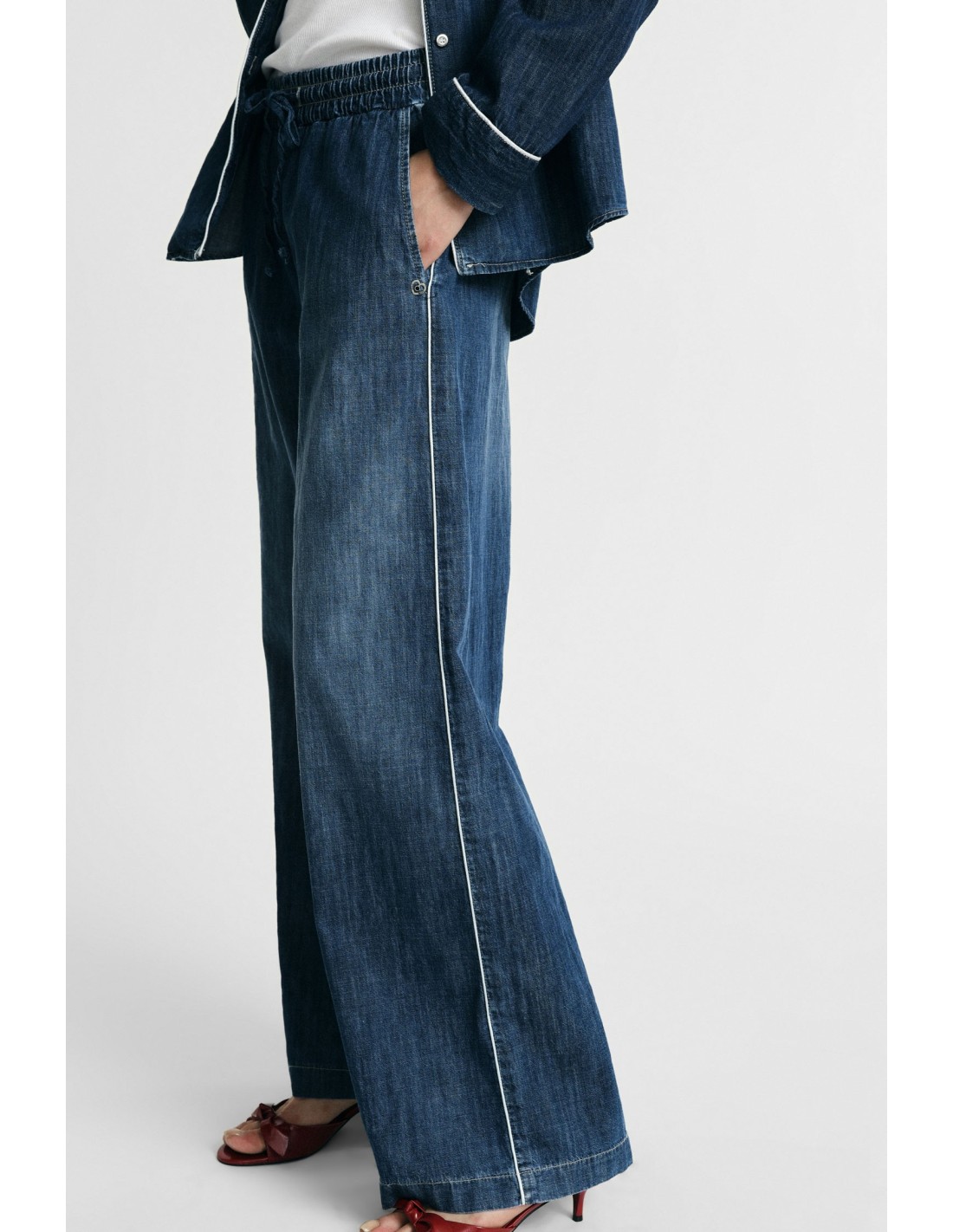 Perfeitos para os dias frenéticos na cidade, estes jeans wide leg com elástico e cordão na cintura trazem uma lufada de energia ao guarda-roupa do dia a dia. A linha ampla promete conforto e estilo sem esforço, ideais para criar looks diferentes do habitual e mostrar a tua personalidade urbana em qualquer ocasião.